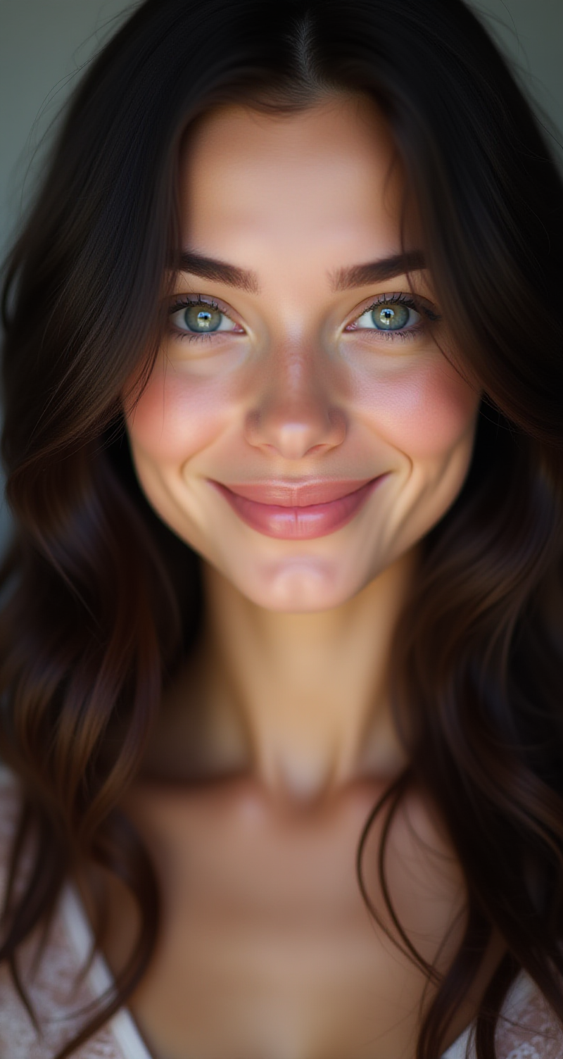 Beautiful 20yo woman with dark hair and blue eyes and a happy smile, photorealistic, perfect natural clean skin, no freckles, studio lighting, no contrast, 50mm lens at f/2.8.