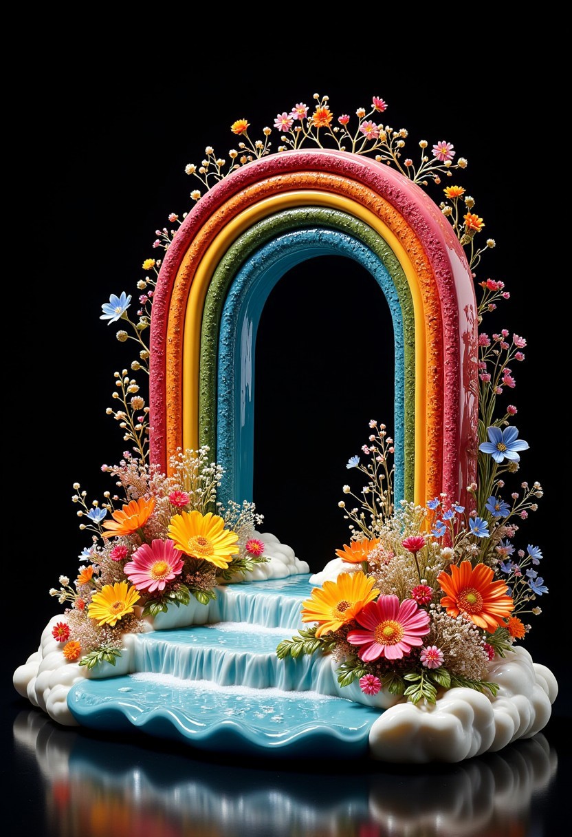 A beautiful statue of a bridge made of rainbow,flowers,Black background,8k,photorealistic,