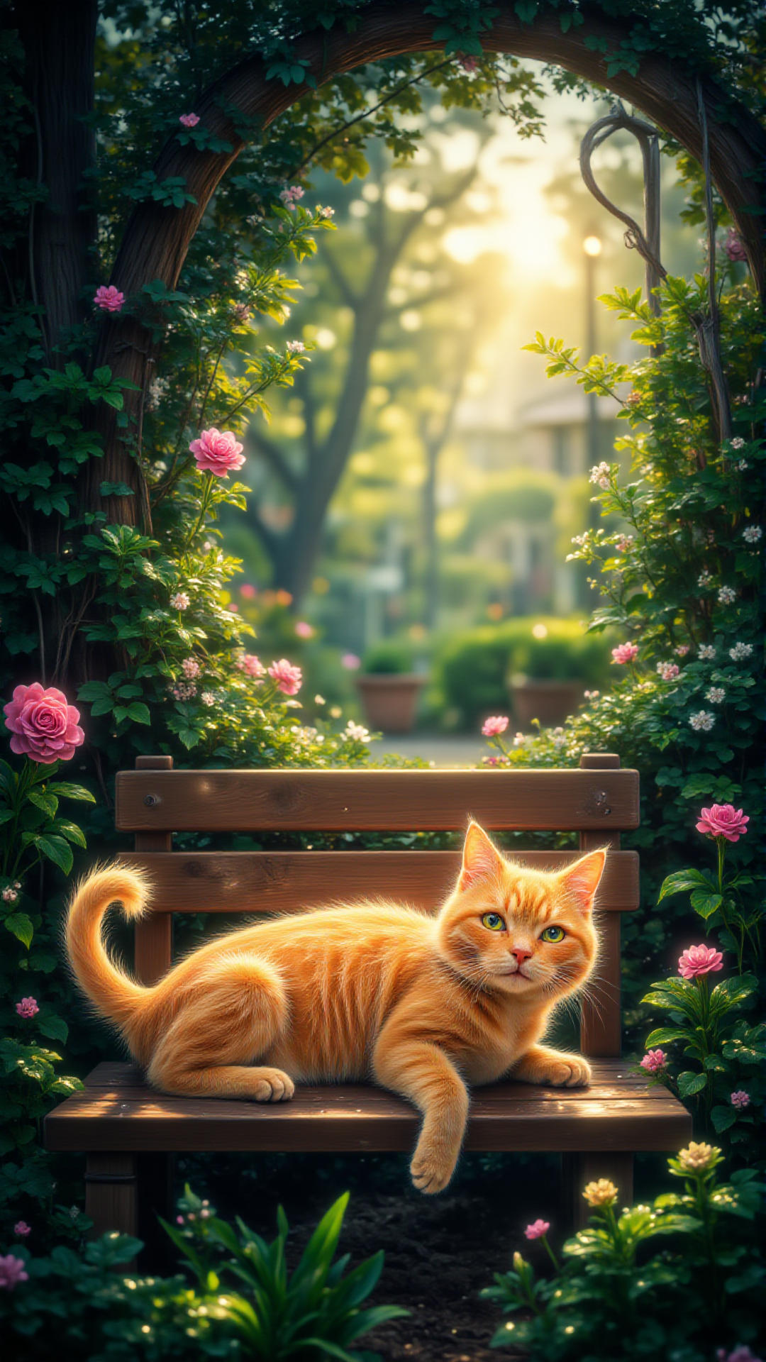 A Yellow Mustard cat with a Oskar, curly tail lounges on a wooden bench in the middle of a lush green garden. The sun shines down on the scene, detailmaximizer, midjourneyv6.1, aidmaglow