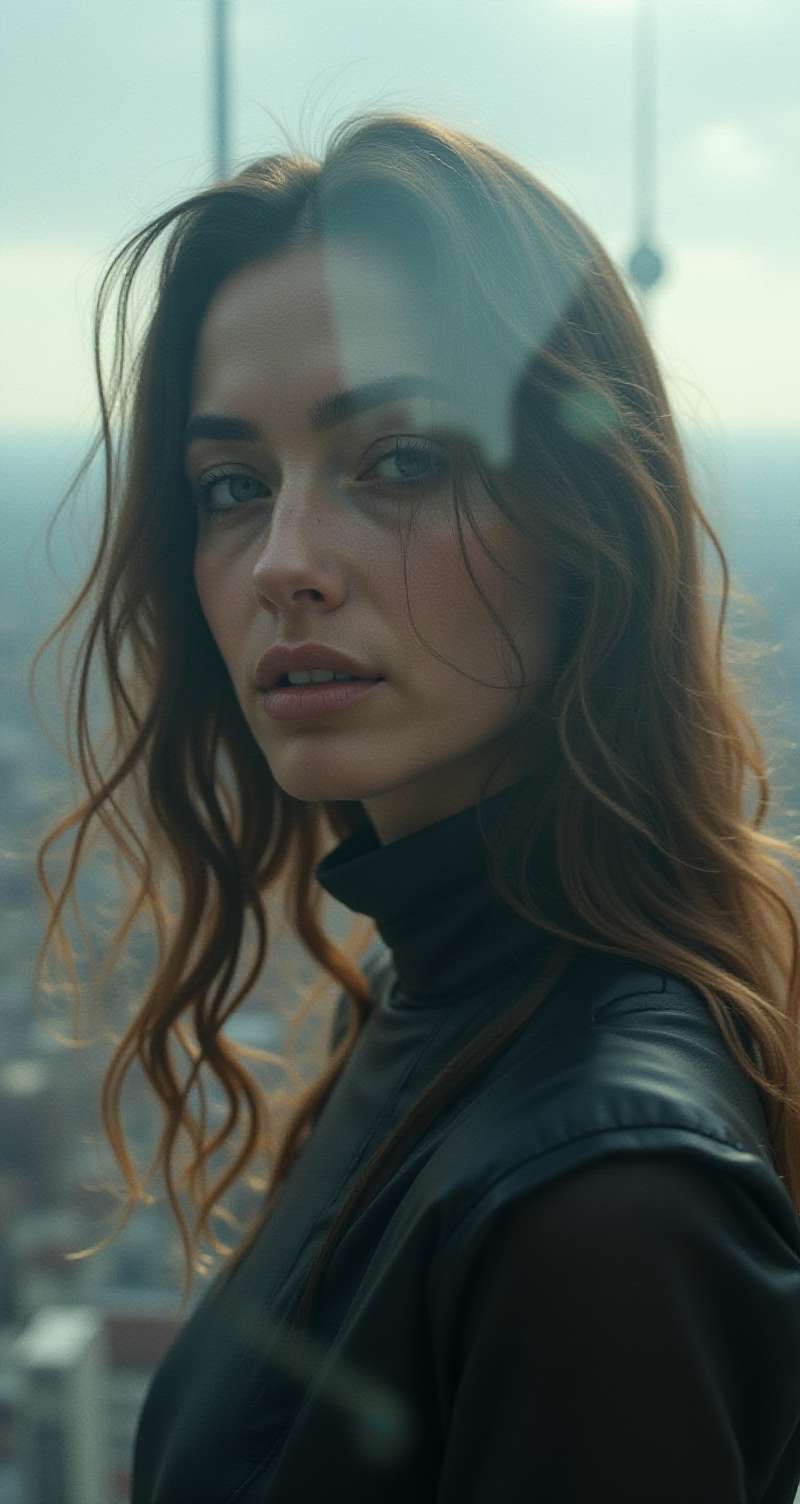 Beauty, realism, cinematography, chiaroscuro, rays of light, play of shadow and light, cinematic quality, Cinematic style. a double exposure image that combines the cityscape of berlin with a close-up of a person's face, tight dress, long hair, creating a dramatic and artistic effect where the two elements merge seamlessly, The image captures the haunting beauty of a cityscape merging with the detailed features of a person's face,