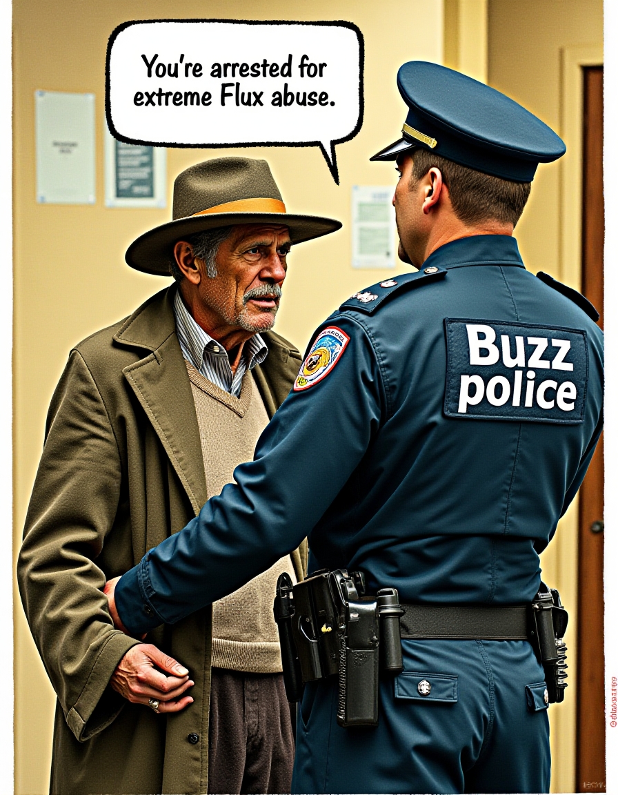 policeman arresting a man as dirty beggar with dirt on his face wearing dirty hat, dirty sweater and dirty coat, policeman says in speech bubble "You're arrested for extreme Flux abuse", on policeman's uniform text "Buzz police", on policeman's back text "Buzz police", <lora:flux\detailer_flux_v1.safetensors:0.7000000000000001:0.7000000000000001>
