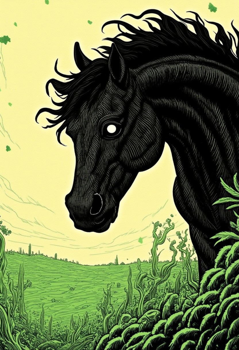 monochrome with color, M100-style, a tree with billowing branches and leafs in a dried out Desert meadow, Green leafs, black eerie horse with multiple eyes,