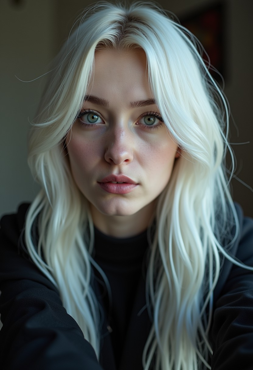 photo of a 30 years old mature beautiful goth female White Raven with platinum blonde hair, gorgeous face, indoor, taking a selfie, (8k, RAW photo, best quality, ultra high res, depth of field:1.1), (absurdres, intricate, photorealistic, masterpiece, ultra-detailed, Unreal Engine:1.3)