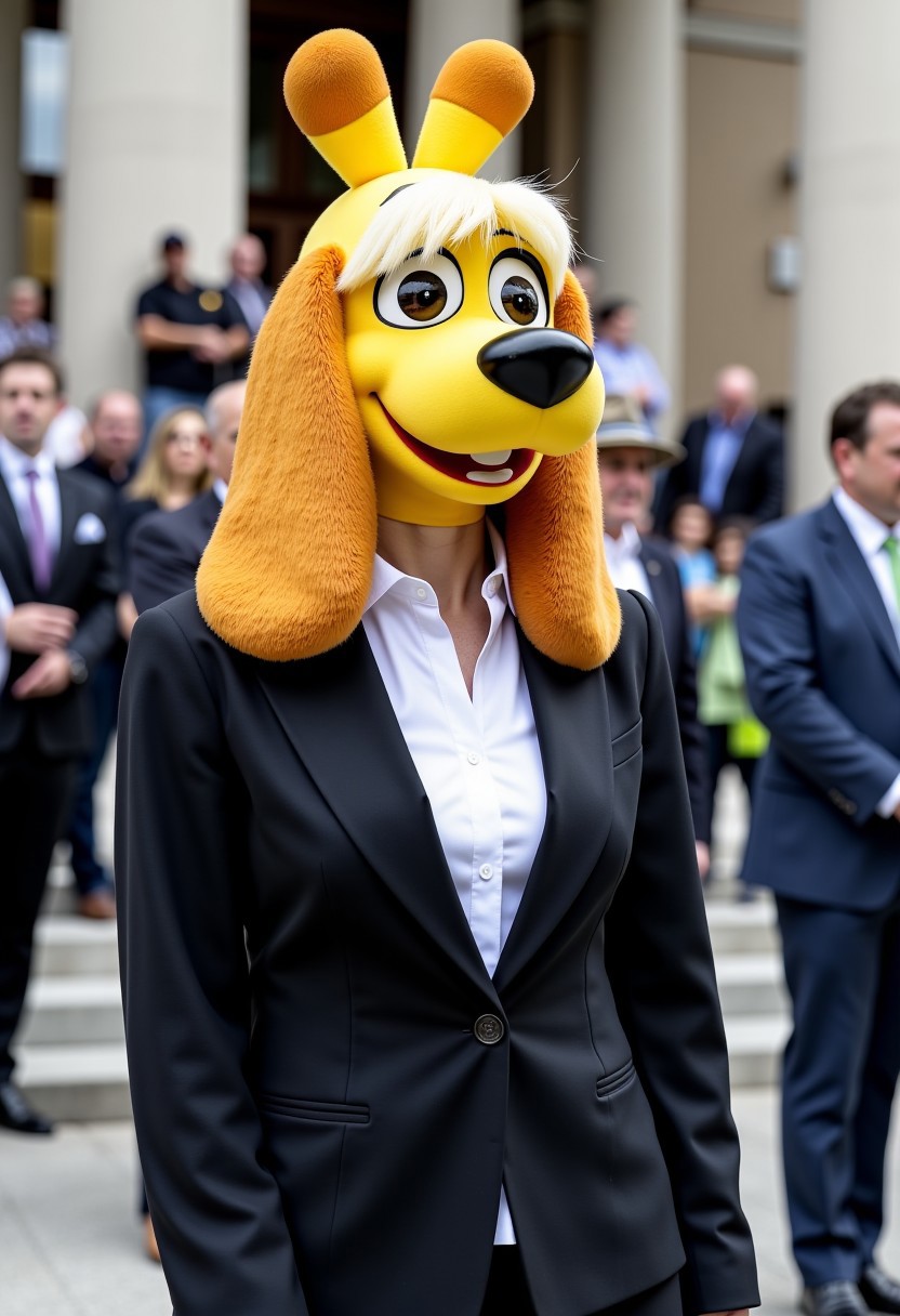 isabelle (animal crossing), anthro dog-woman, blonde bangs, floppy dog ears, big eyes, yellow fur, in a power suit standing proudly in front of a courthouse. she just won a long drawn out court case, and reporters are trying to get her attention for interviews and photos