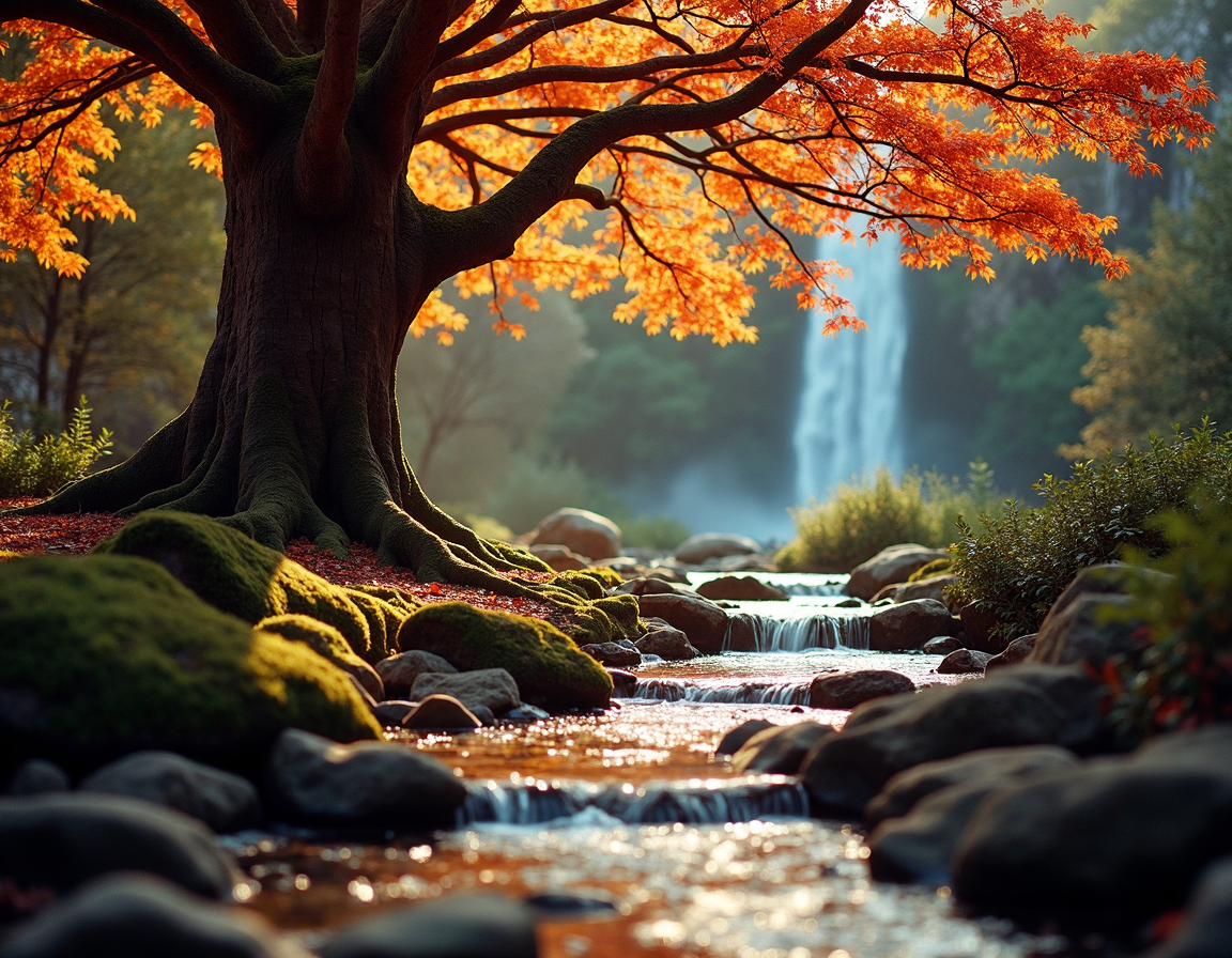 artistic photograph, Selective focus, ektachrome, Beautifully Lit, Fujicolor Fujichrome Velvia 100, warm Lighting, a breathtaking scene unfolds before your eyes as you gaze upon the stunning image of a majestic monumental tree standing at a stream with lots of small waterfalls. The leaves of the trees are a vibrant orange and red, their branches reaching out to touch the sky. The stream is surrounded by lush autumn greenery and rocks, an ancient rock-face in background, the sun casts a warm glow on the scene. The air is filled with the gentle rustling of leaves in the breeze. This is a day that defies explanation, but it's clear that this moment is both beautiful and captivating. Ilford HP5+ 400, Rembrandt lighting, Phase One XF IQ4 150MP, Circular polarizer, national geographic,