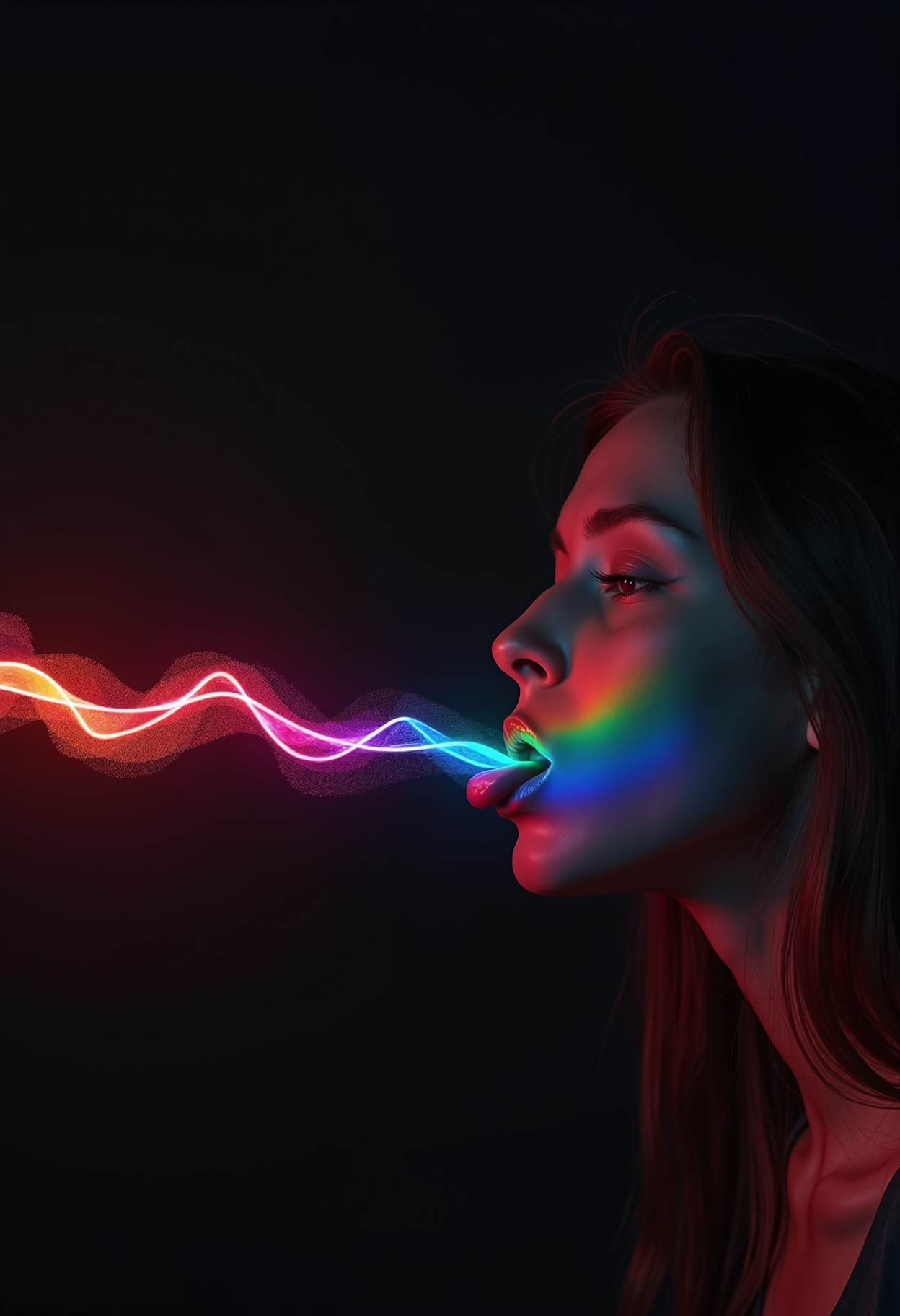pitch black background, horizontally centered sinusoidal rainbow wave[ :, close-up portrait of a SINGLE woman looking at the camera licking the rainbow wave that is floating in front of her face : 1]