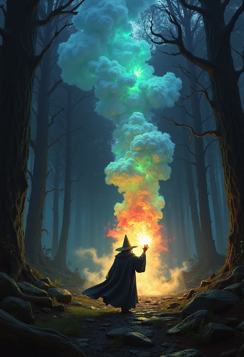 An atmospheric and powerful dark fantasy, natural organic and impressionist classical-style painting , Merlin, the eccentric wizard, experiments with a new potion, causing colorful explosions that light up the twilight forest. The dreamlike smoke from his concoction blends with the natural mists, creating a spectacle of magical chaos., in the style of shrek 80s VHS tape dreamcore retro fantasy, nostalgic, dreamlike quality, VHS screen grab