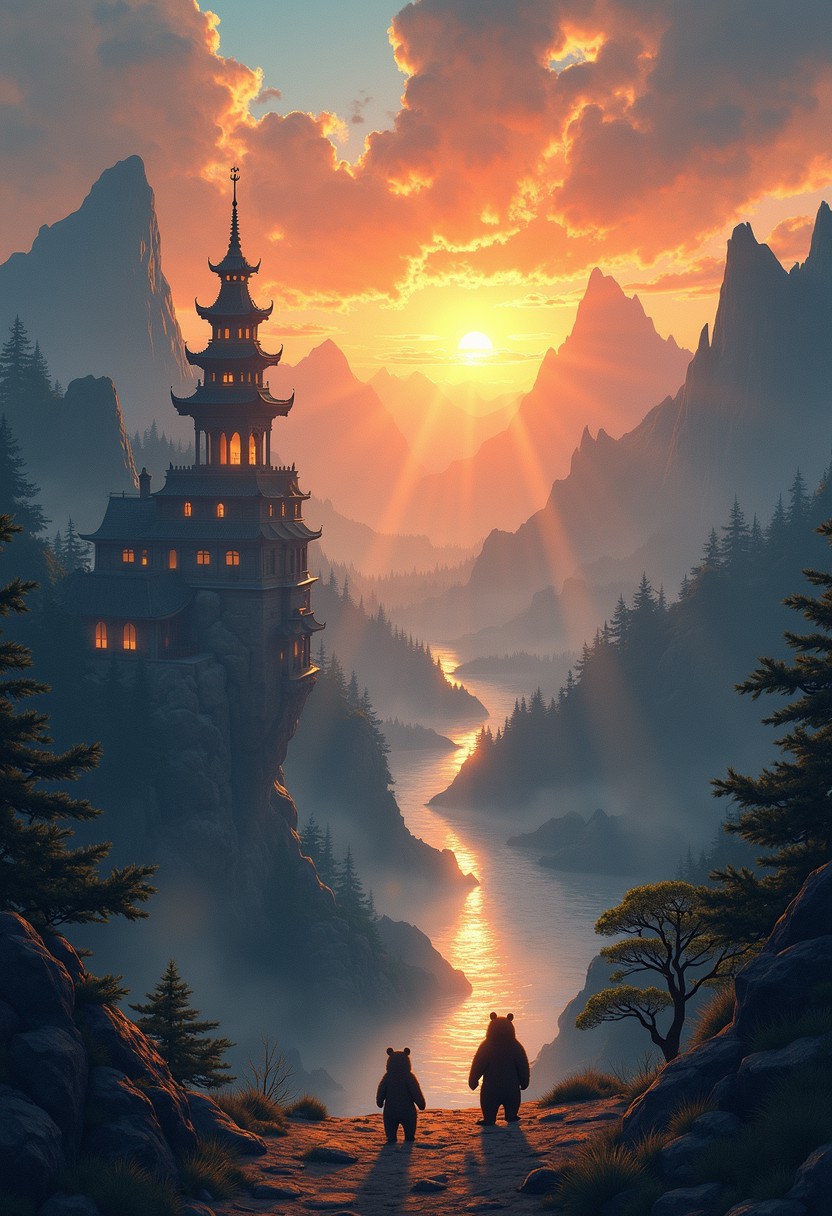 A vintage cartoon of a bear kingdom cityscape. It is late summer evening and sun is about to set, casting dramatic shadows over the city. Rays of light shine through the misty haze that covers the land. Mountains and rivers in the background. Mysterious and delightful. Prominently displaying colors of golden honey and ethereal blue. A temple of the bear has shining lights. Anthro bears walking on the streets. It's a bear kingdom., realistic, cinematic, highly detailed, photograph, epic, masterpiece, beautiful colors