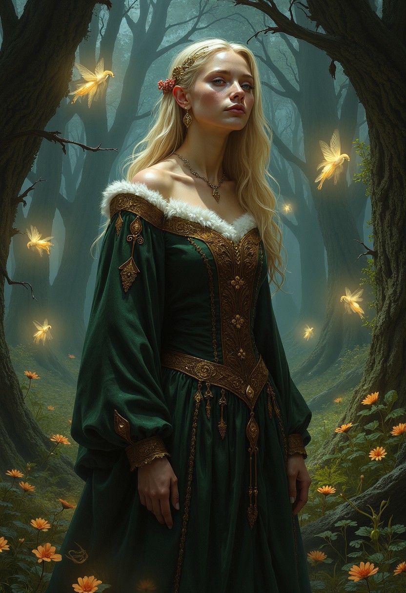 An atmospheric and powerful dark fantasy, natural organic and impressionist classical-style painting , beautiful blonde princess, medieval attire, surrounded by glowing fairies, in the style of an old 80's VHS dark fantasy, VHS screen grab, grainy, old footage, in the style of an old 80's VHS dark fantasy, VHS screen grab, grainy, old footage
