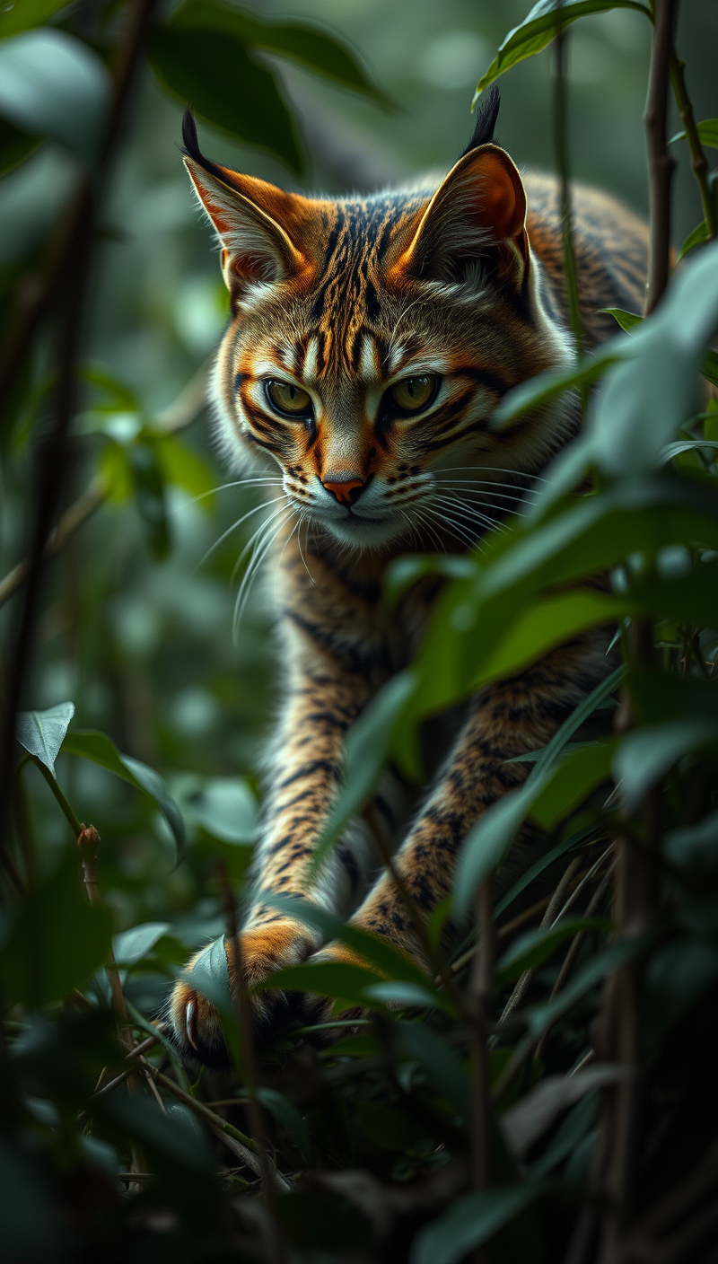 a majestic cat woman creature, lurking through the undergrowth hunting