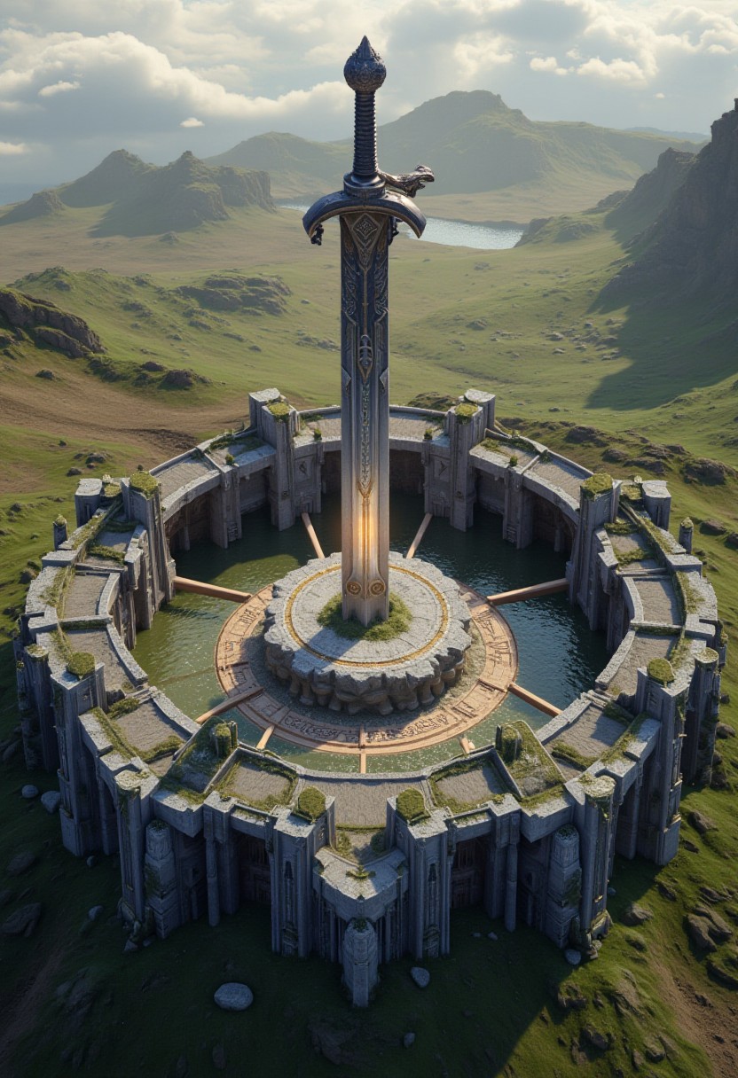microarchitecture, abstract from above, Legendary metal sword standing vertically, blade-down in a hexagonal stone, centered in a perfect circle of identical runestones, each aligned with its counterpart across the circle, set in a vast plain where the landscape forms concentric, symmetrical rings of different terrains (grass, water, rock) extending to the horizon, under a sky where clouds form perfect symmetrical patterns. style of greg rutkowski,janek sedlar,jenny saville:0]