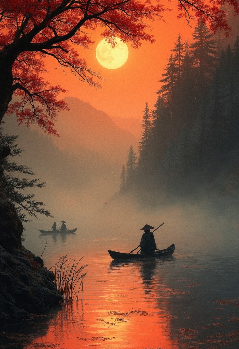 linquivera, Ink illustration, brown tones, aged black red paper, inkpunk, moonlight, surreal, detailmaximizer, BREAK detailed painting of japanese fisherman punting on lake, misty, mount fuji in background, faint sunlight
