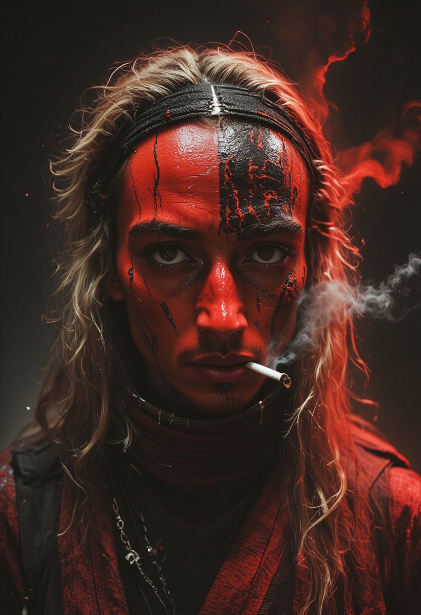 n30nfilm, Realistic analog photo, awesome, high Quality, photorealistic, atmospheric lighting, volumetric lighting, cinematic, Epic Film Quality, OUtlaw Flair, space cowboy, smoking cigarette, sftsrv style but in realistic, Feudal neo Tokyo in the Fantasy style of Jan Vermeer, ethereal charming wired princess Cyborg Samurai extreme intricate technical parts Face Closeup, wires and cables AS well as translucent Vintage mechanical robotic hoses, vibrant bleaked Red/grey and deep black color graded, Long blonde billowing hair, throwing kiss, Hairband,