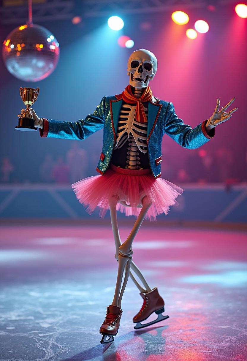 A highly detailed 4K image of a skeleton dressed in a retro ice-skating outfit, complete with a flashy sequined jacket, tutu, and a colorful scarf. The skeleton is gracefully mid-spin on a glistening ice rink, performing an exaggerated, comical ice-skating move with arms flailing. The ice rink is illuminated by bright, vibrant spotlights and a twinkling disco ball hanging from above. The skeleton's empty eye sockets are wide with gleeful concentration, and its bony grin is hilariously enthusiastic. In one hand, it’s holding a tiny ice-skating trophy, while the other hand is in the air, as if striking a dramatic pose. The scene is filled with colorful light reflections on the ice, making the skeleton’s performance a funny and visually captivating spectacle