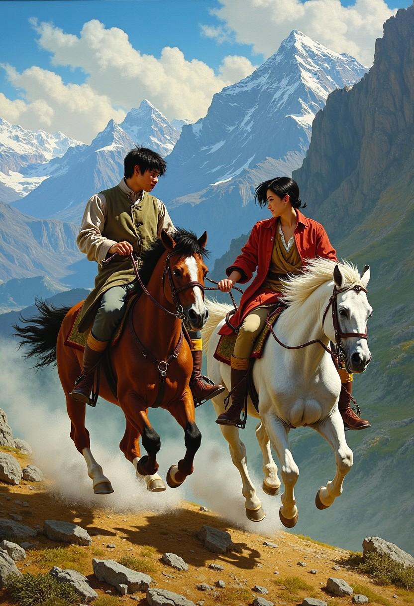 A painting in romantic style depicts the protagonist of berserk anime guts and casca riding horses in a mountainous landscape. The guts is on a brown horse, while casca is on a white horse. The woman is looking up at guts, who is looking down at her. The horses are galloping, and the scene is set against a backdrop of mountains and clouds. The painting captures the sense of adventure and romance between the two characters as they traverse the majestic landscape.