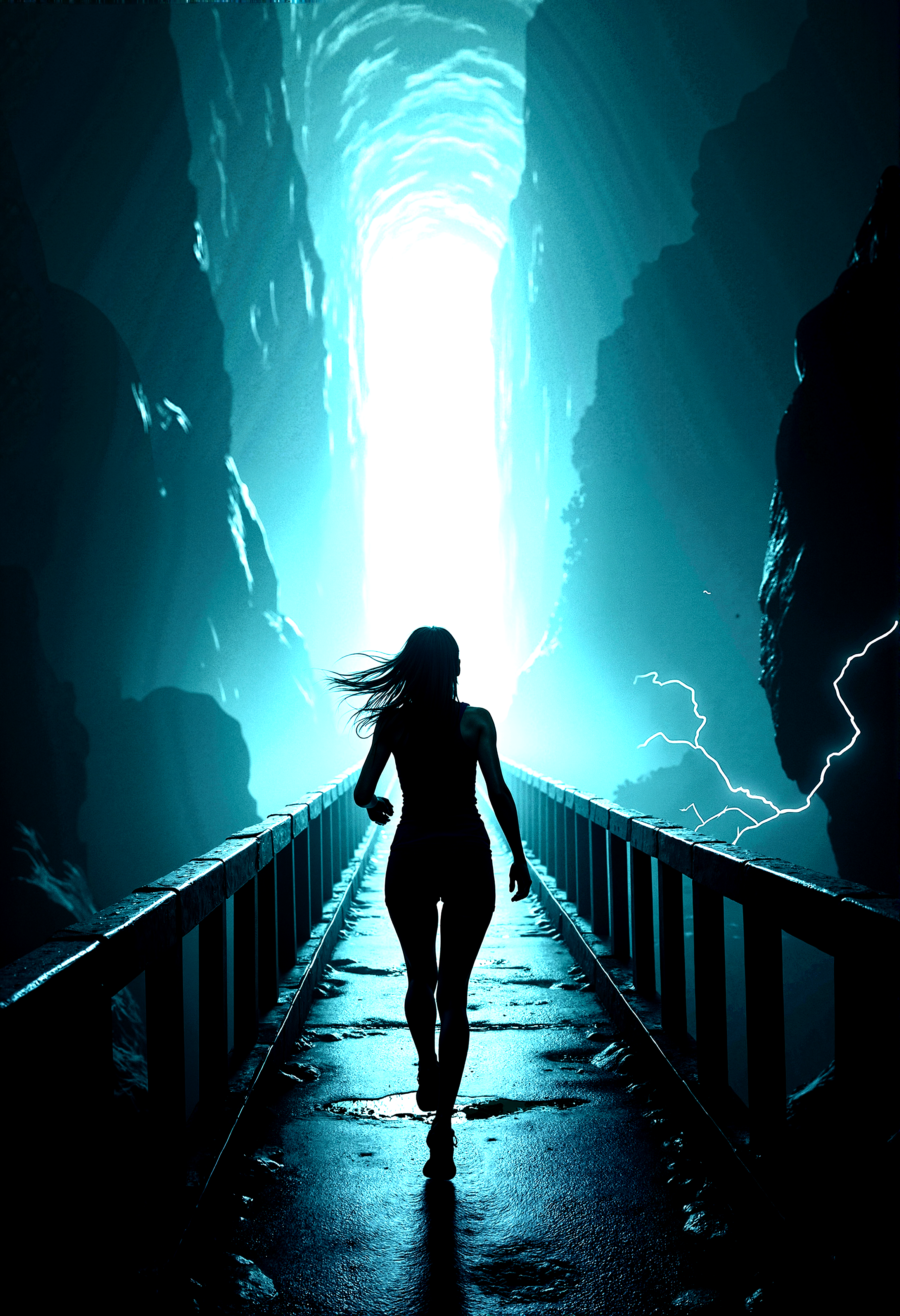 extremely photorealistic depiction of The last frontier, A very close-up third person view from behind of a Female adventurer quickly sprinting towards a massive, illuminated tunnel, ready to step into the unknown.A long, seemingly endless bridge leading to the glowing tunnel.A dark, stormy environment with constant lightning strikes and electrified air.