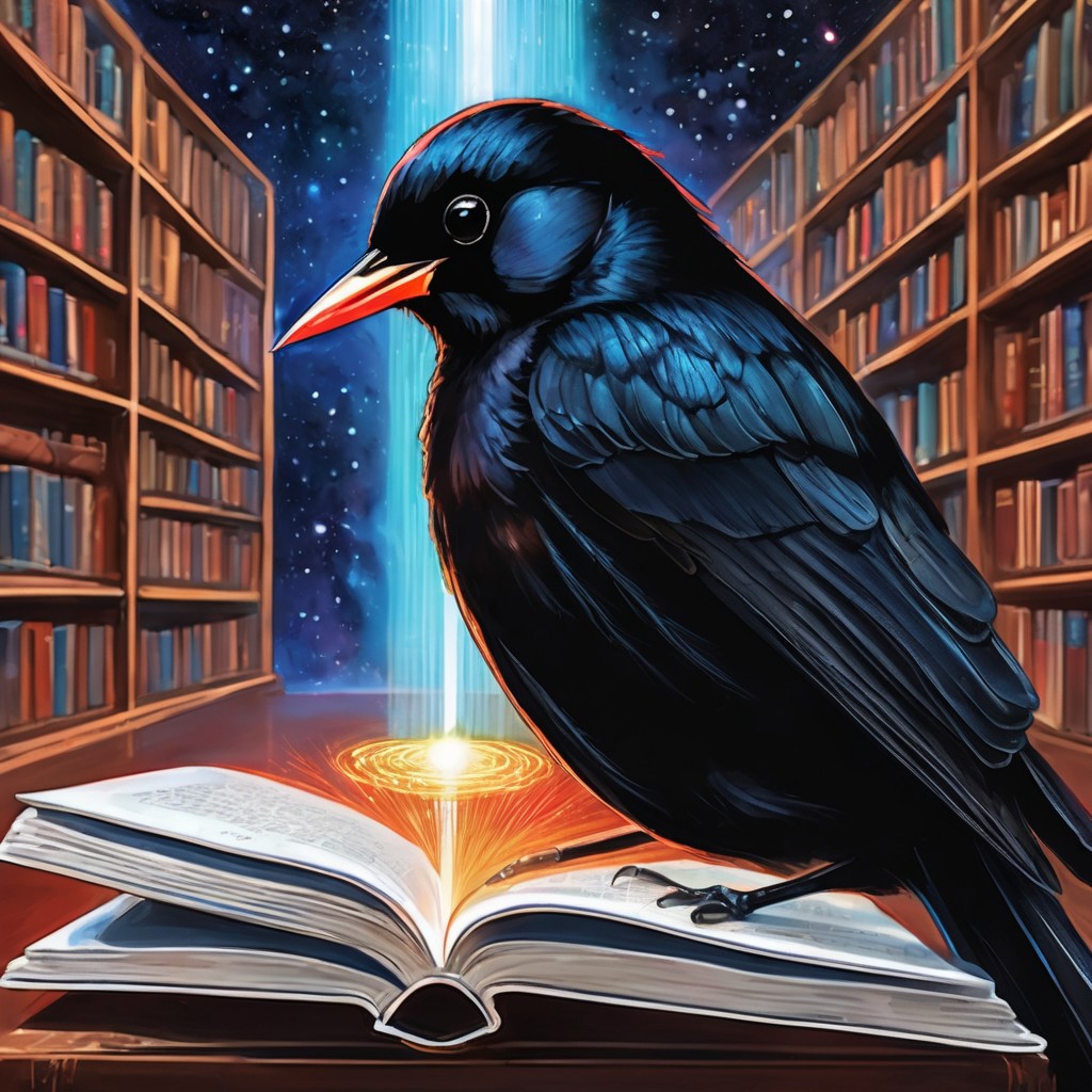 A red-winged blackbird studies a book in a library floating in the deep depths of outer space. With a faraway look in his eyes, he uses sorcery to examine the metaphysical connections between the glowing iridescent translucent strings of the multiverse.