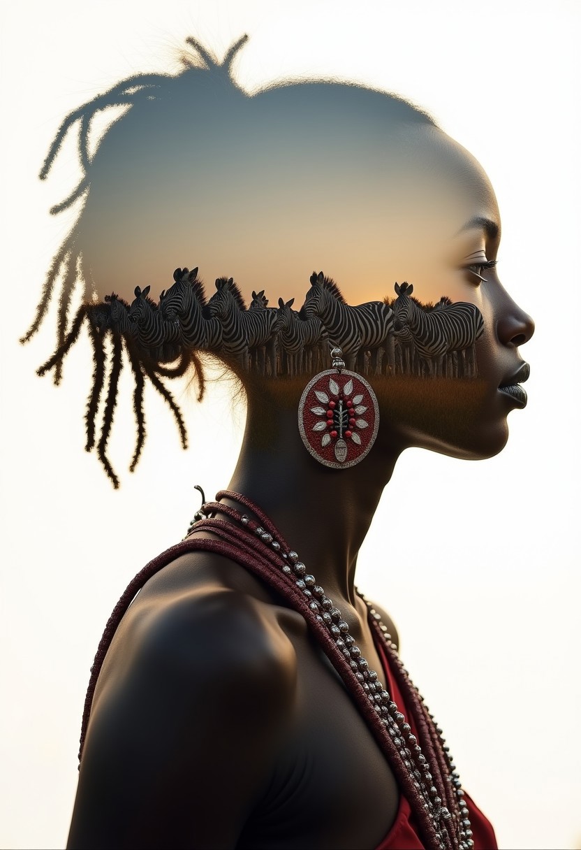 masterpiece, double exposure, silhouette of african zulu woman, hair ornament, filled with a herd of zebras, highest definition, HD32K, wallpaper, crisp lines, double exposure background, hyperdetailed, concept art, detailmaximizer