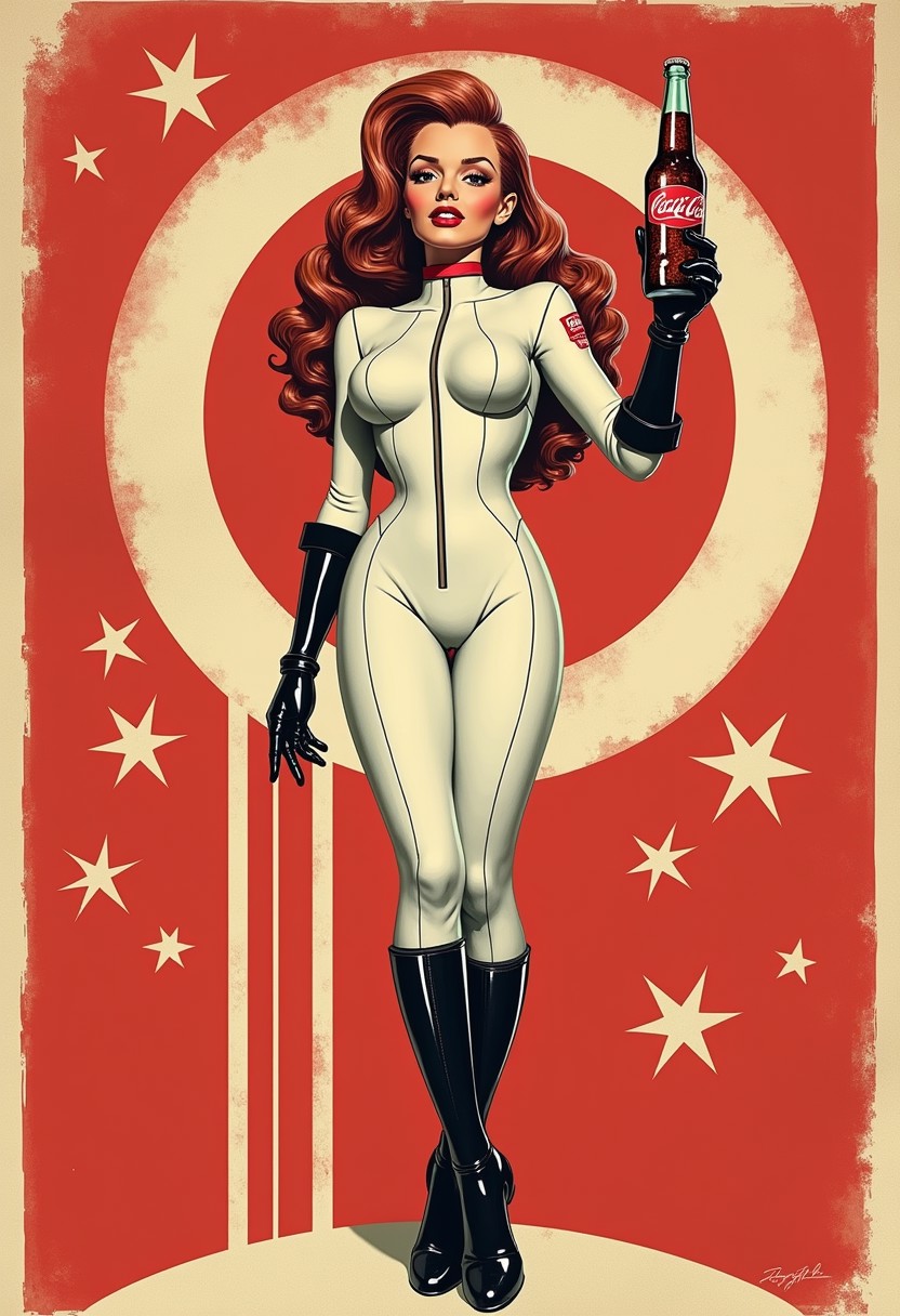 Retro-futuristic pin-up astronaut with a 1950s aesthetic, posed in a playful and confident manner, wearing a tight white space suit with red accents, black gloves, and high-heeled boots. She holds a vintage, ray gun-style soda bottle emblazoned with "Nuka Cola," set against a vibrant red background with bold white stars and a circular emblem. The scene captures the nostalgic optimism of mid-century space exploration fused with the sleek style of classic Americana advertising. [Retro-Futurism | Pop Art | 1950s Pin-Up] [Digital Painting | Poster Art] in the style of [Roy Lichtenstein | Norman Rockwell | Gil Elvgren], [halftone shading | airbrush effects | bold outlines], inspired by [Fallout | Atomic Age | Space Age Pop].