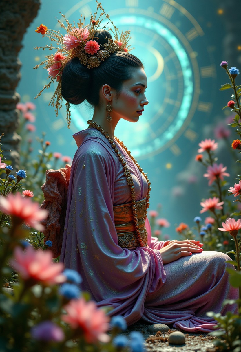 A professional photography of a gothic geisha with whimsical elements, surrounded by an magical and eerie fairytale landscape with sparkling crystals and colorful flowers, awesome appearence, fantastic cyberpunk art concept, intricate details, trending on artstation, masterpiece, 8k, celestial astro beauty, astrological calendar, crescent moon, galaxy, stars