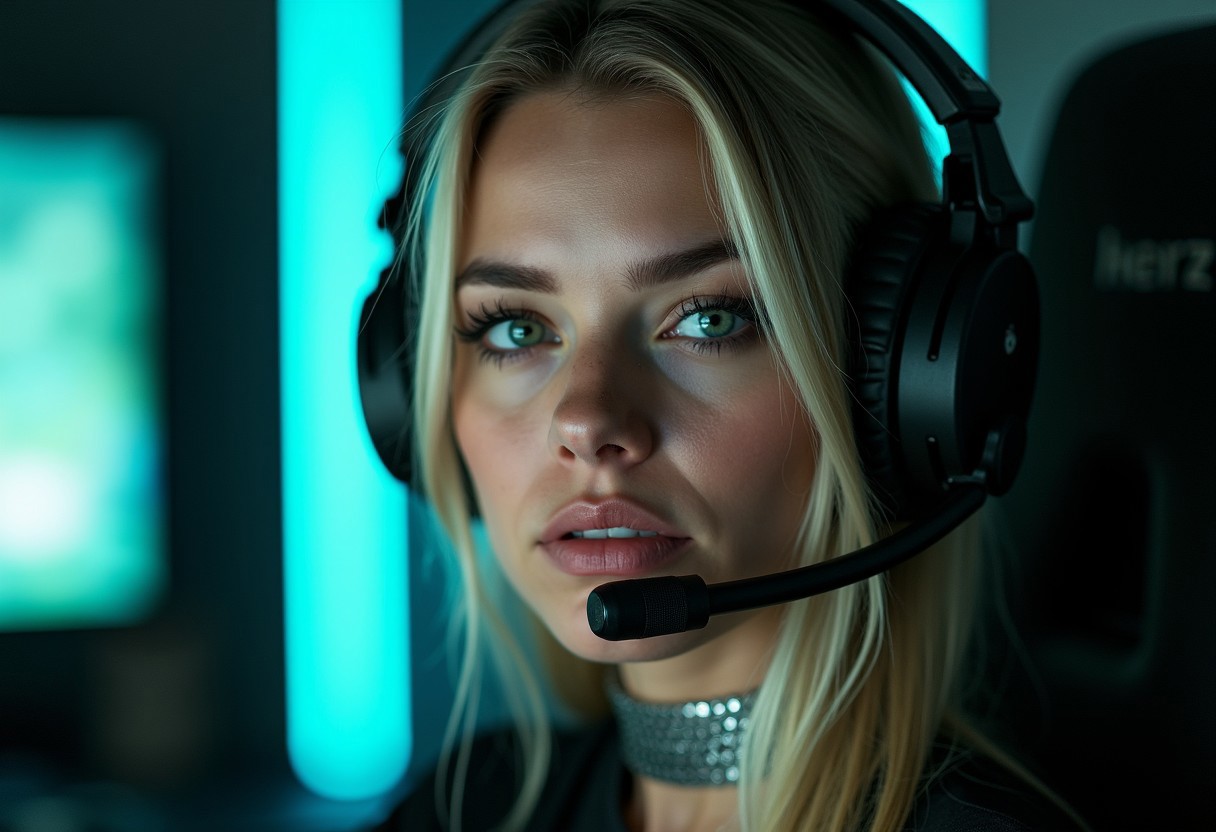 (ultra realistic,32k, ultra sharp,masterpiece:1.2),(high detailed skin:1.1),( high quality:1.1),(ultra high res:1.4), (beautiful lighting:1.4), (dynamic angle:1.6); close-up portrait of a woman with long blonde hair and striking green eyes, sitting in a gaming chair. She wears a black top and a shiny metallic choker, highlighting her features. The background is softly lit with a bluish-green glow, creating a vibrant, modern atmosphere. Her expression is serious and focused, with a slight shine on her lips.