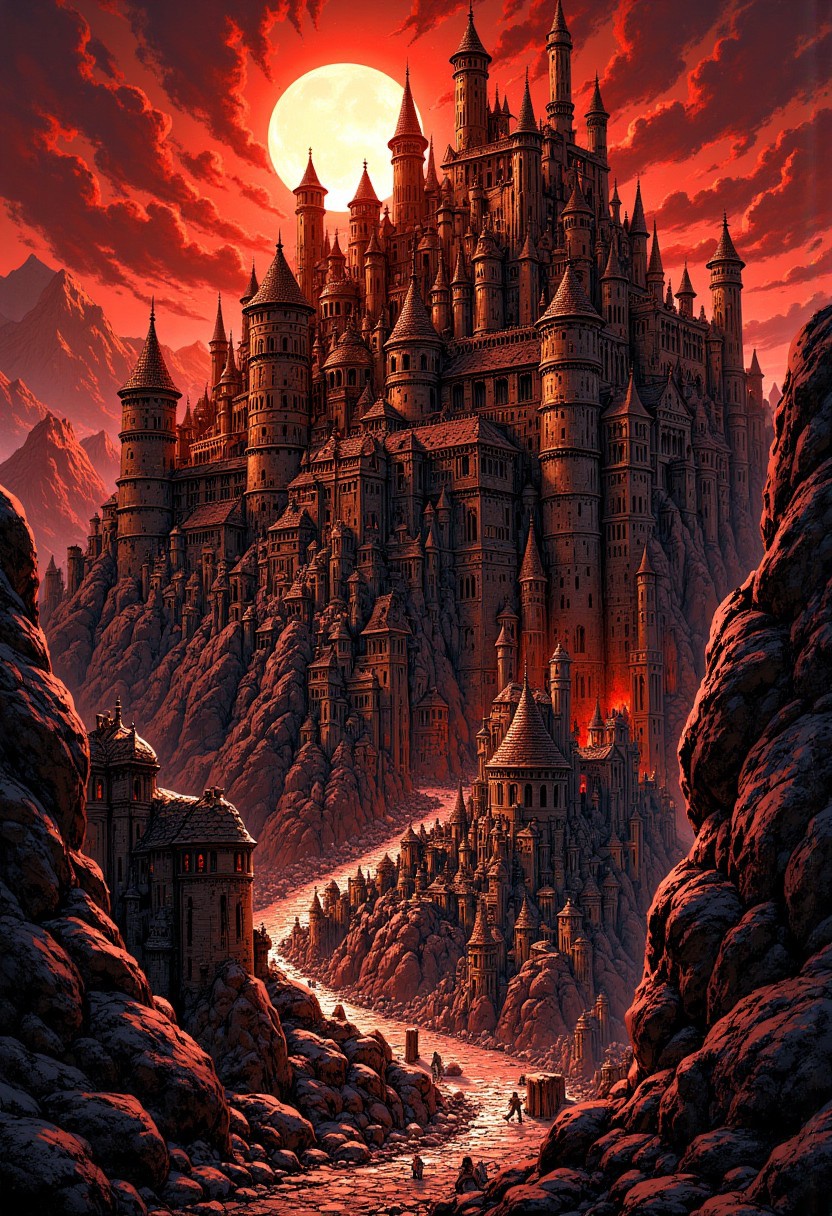 linquivera, Ink illustration, brown tones, aged black red paper, inkpunk, moonlight, surreal, detailmaximizer, BREAK medieval fantasy city situated at he base of a mountain range, comprising citadel, city walls, towers, streets, mythp0rt
