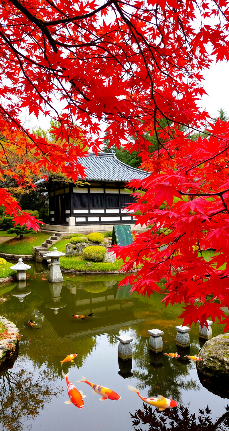 A tranquil Japanese garden during autumn, with vibrant red and orange maple leaves falling around a koi pond, stone lanterns, and a traditional tea house in the background.