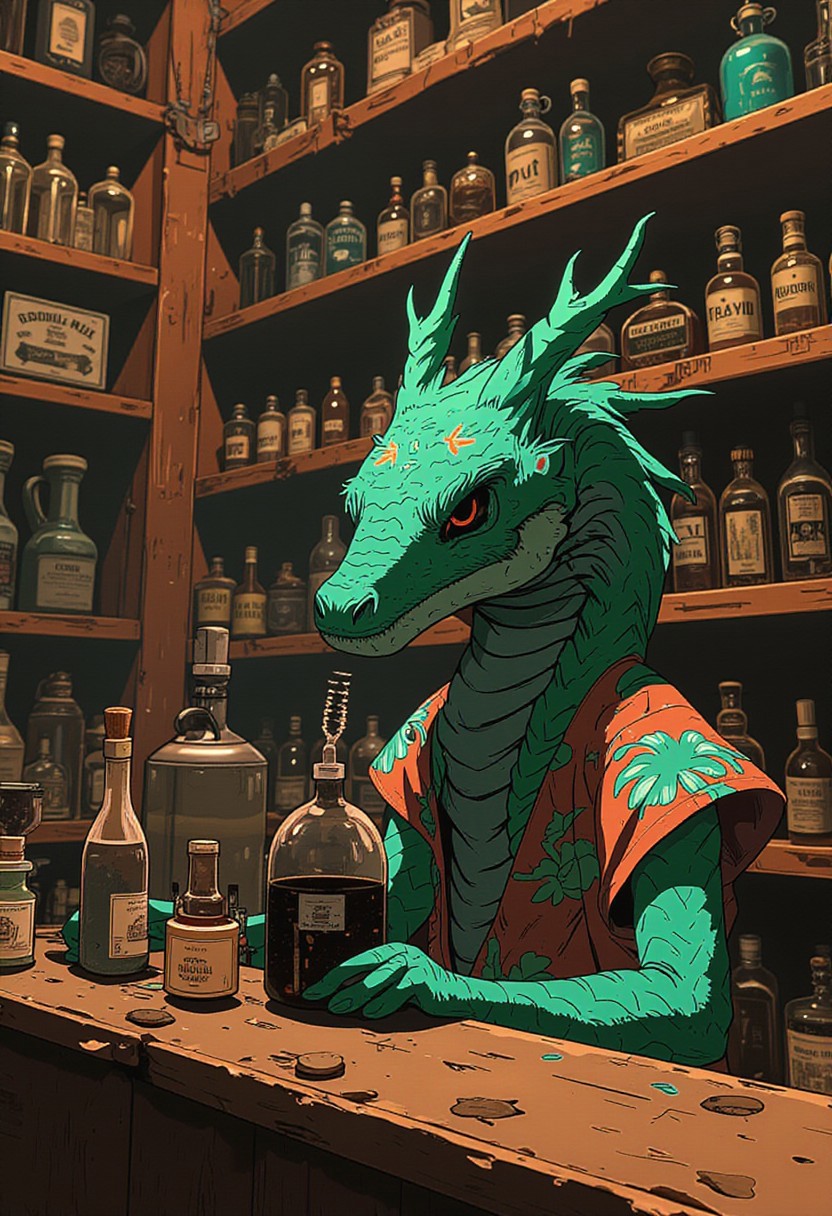An anthro naga apothecary wearing a colorful flower patterned dress is standing behind the counter and offering a dark murky potion to you. Numerous shelves and cabinets dominate the surroundings while a small workstation stands on the side with a mortar and basic alchemical apparatus. The naga's scales have a green jade hue and the shelves are made of deep aromatic sandalwood. There is a sign with the apothecary symbol on the wall. The scene has an atmospheric cinematic look with vibrant colors and contrasting shadows and light. Masterpiece.