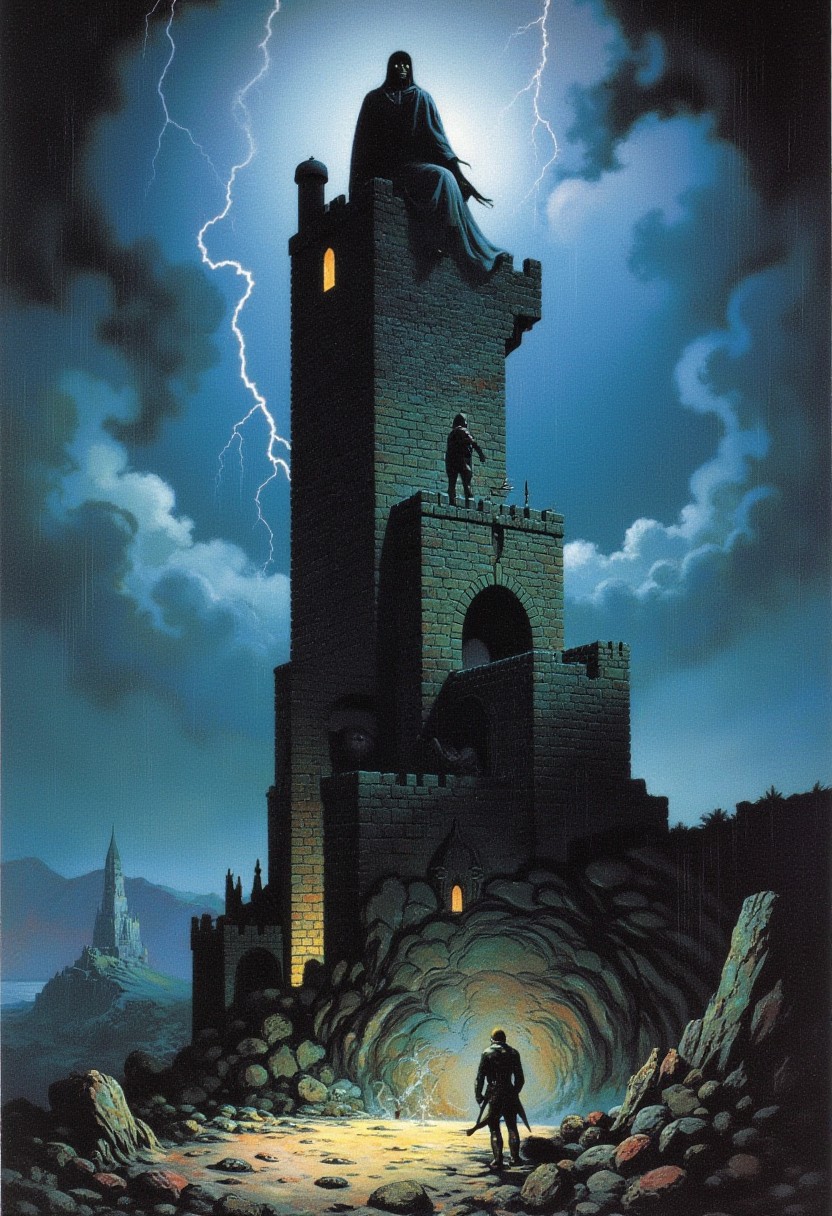 Frank Frazetta surreal fantasy oil painting of a huge foreboding tower made of onyx bricks, heavy rain and storm clouds in the background, flashing lightning backlit tower, ominous shadow of a figure on top of the tower