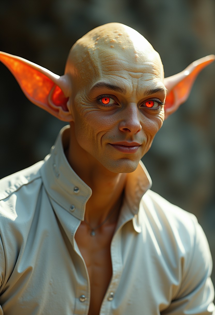 portrait of a friendly male bald elf with slightly scaly golden skin, with red eyes, big pointed ears, in elegant white sci fi shirt, sci fi background, day light, cinematic, UHD, analog image,
