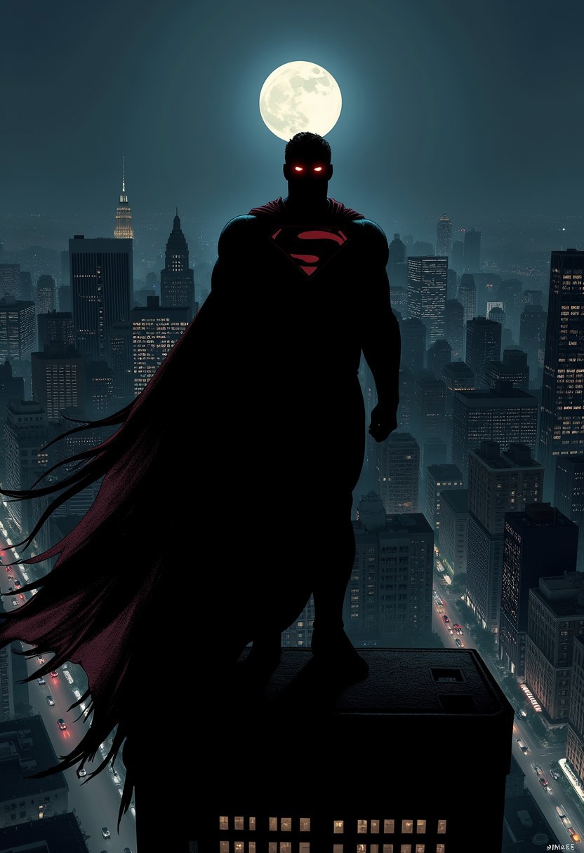 jimlee style, comicbook illustration, the main subject is superman, superman standing on highest skyscraper rooftop, he is surrounded by shadows and his making his face completely black with only two red eyes visible, long torn windblown cape that covering his whole body right from the shoulders, street dimly light with car lights down below, dark noire atmosphere, black sky, moonlight, <lora:sxz-Jim-Lee-Flux:1>