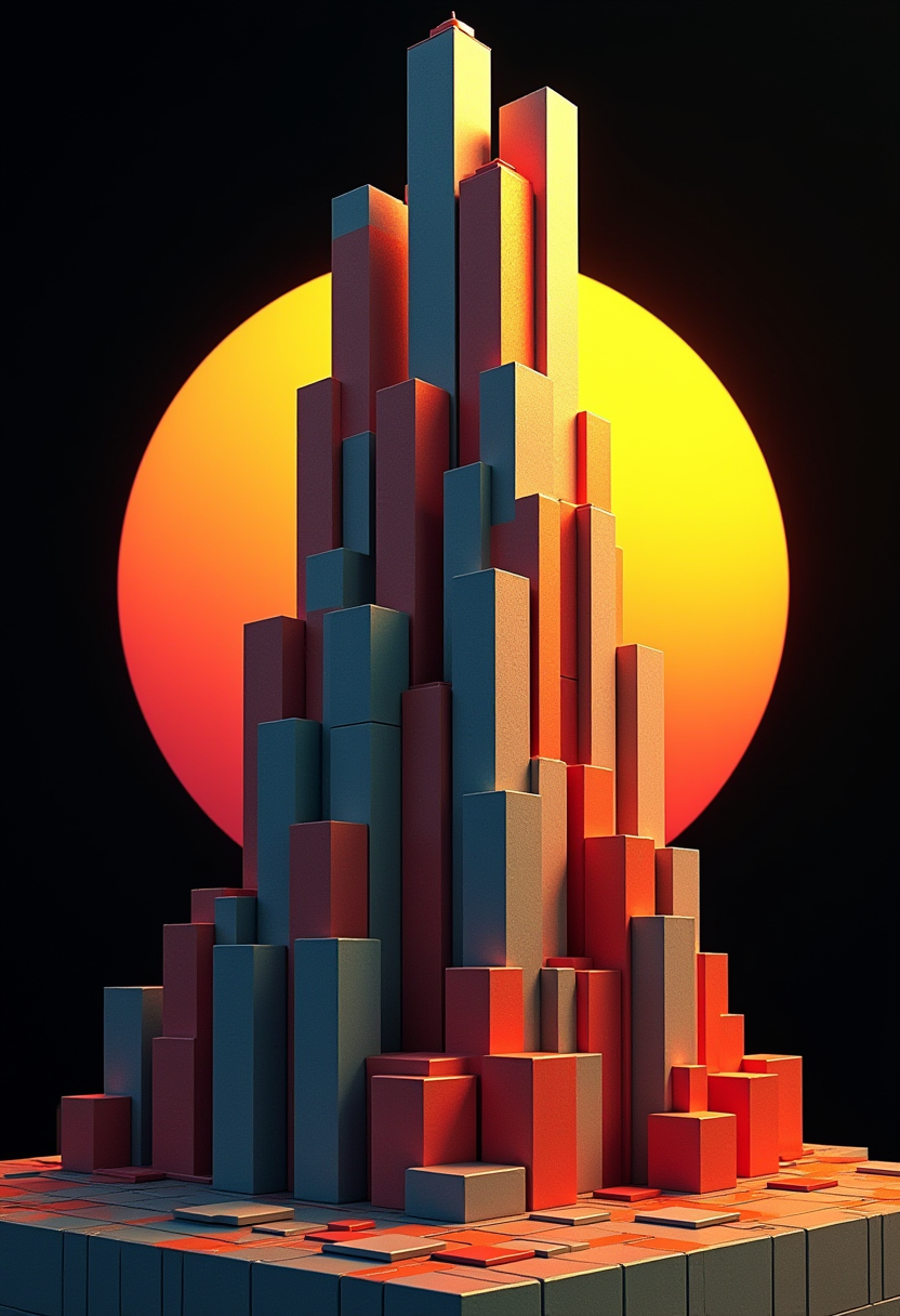 In this striking 3D artwork, a geometric constructivism sculpture dominates the scene. Consisting of interlocking rectangle tetris forms, it depicts a skyscraper rising majestically into the sky. The lighting conditions create a warm, inviting atmosphere, as the sun casts a golden hue on the building's facade. The vivid colors pop against the black background, emphasizing the intricate details of the artwork. This masterpiece is sure to catch the eye of any viewer on the trendy platform, ArtStation.