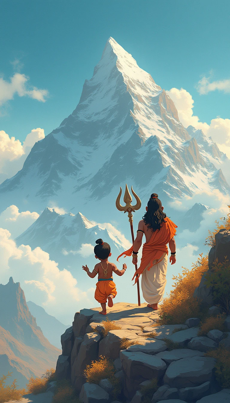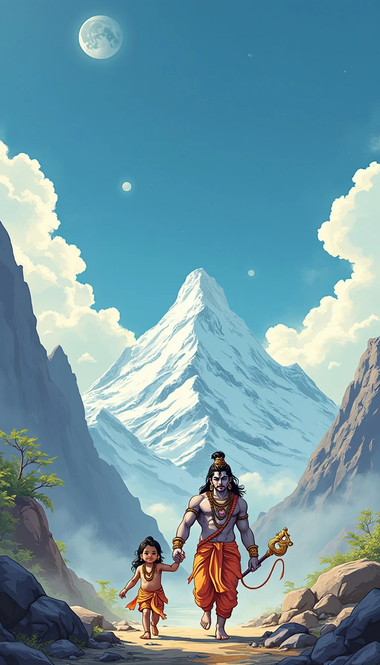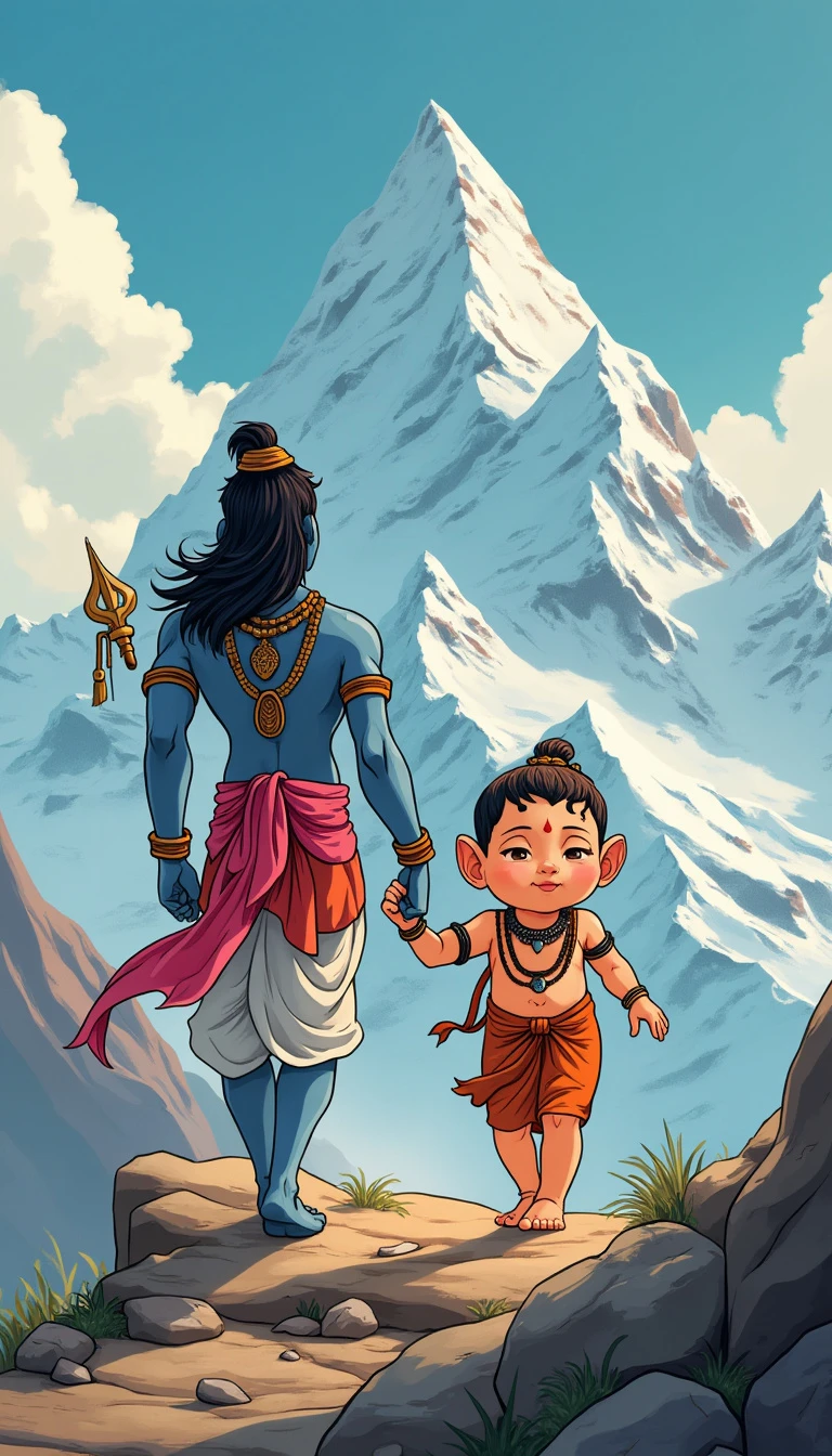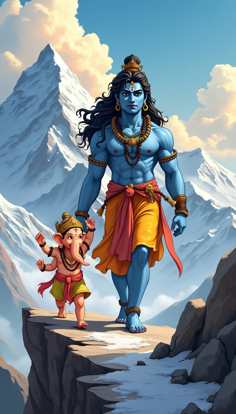 cute little god ganesh walking with god shiva on himalaya