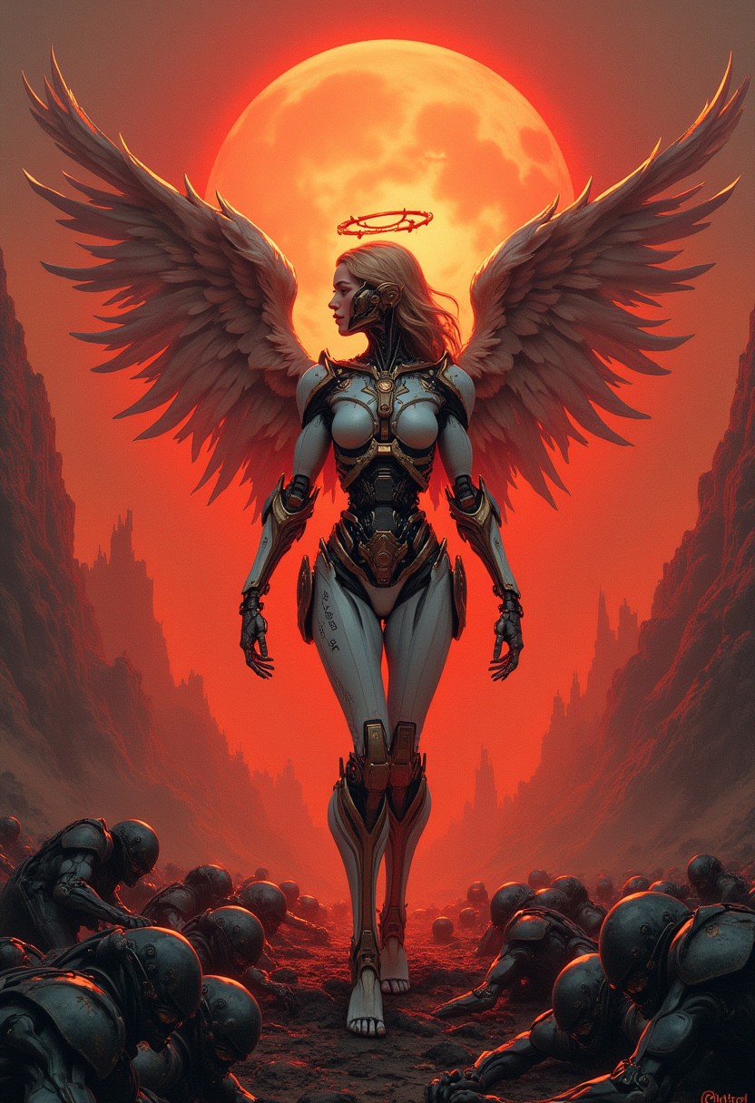 Mystical angelic cyborg girl, cyborg girl with robotic body, saint halo, bright glowing angel wings, red sunset in hellish landscape, metal cyborg monsters crawling beneath her feet, amazing masterpiece,