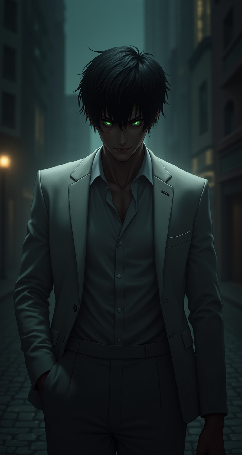 , sharp focus, extremely detailed ((masterpiece, best quality)), 1Male, Demon man in business suit, comes out of the fog, crooked smile, short black hair, beautiful eyes, green glowing eyes, brutal man, night, fog, madness, fear, scar on face, (cowboy shot), black short hair, white business suit, suit unbuttoned, white shirt, scar on face, ruffled hair, piercing look of beauty, mystic atmosphere, empty street at night, scarlet fog and haze, (cowboy shot), concept art, expressiveh, Dark Fantasy page, ral-dissolve, <lora:Lora\Dark Fantasy.safetensors:1:1> <lo