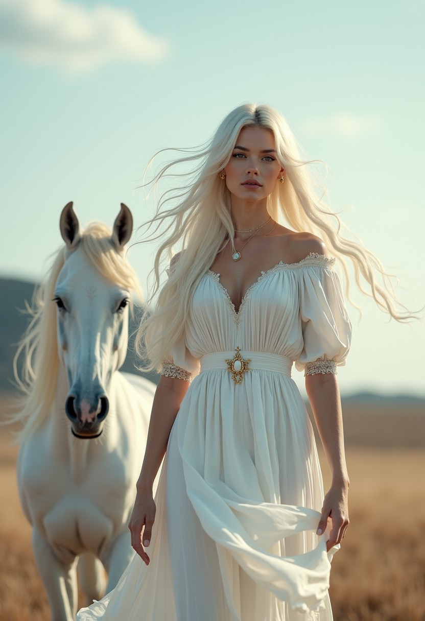 Here is the image of a beautiful woman in white with white very long hair flowing in the wind in a fantasy place, a beautiful white unicorn next to her, high detailed, 8k, very realistic.