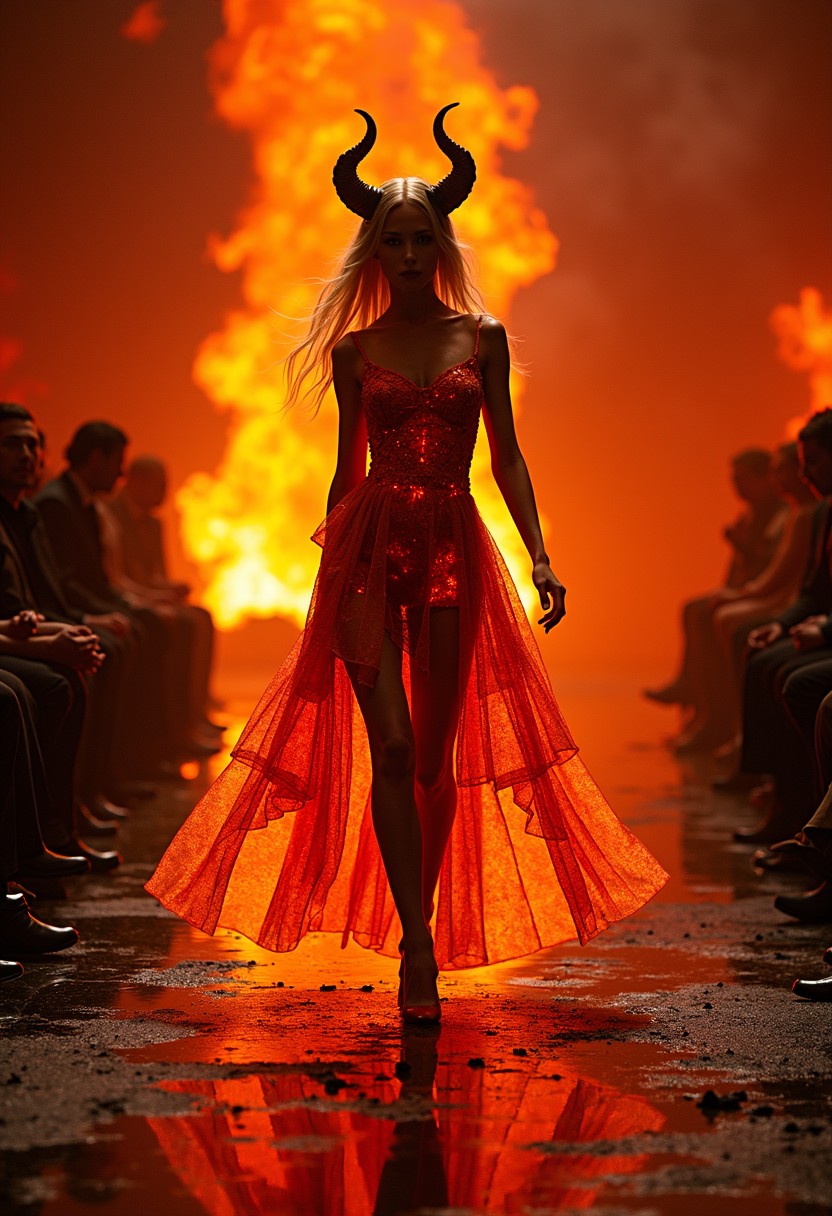 Here is the image of the hell-themed fashion show, featuring a devilish woman walking the catwalk in a stunning fire dress. The surreal and highly detailed scene captures the intense, fiery atmosphere perfectly.