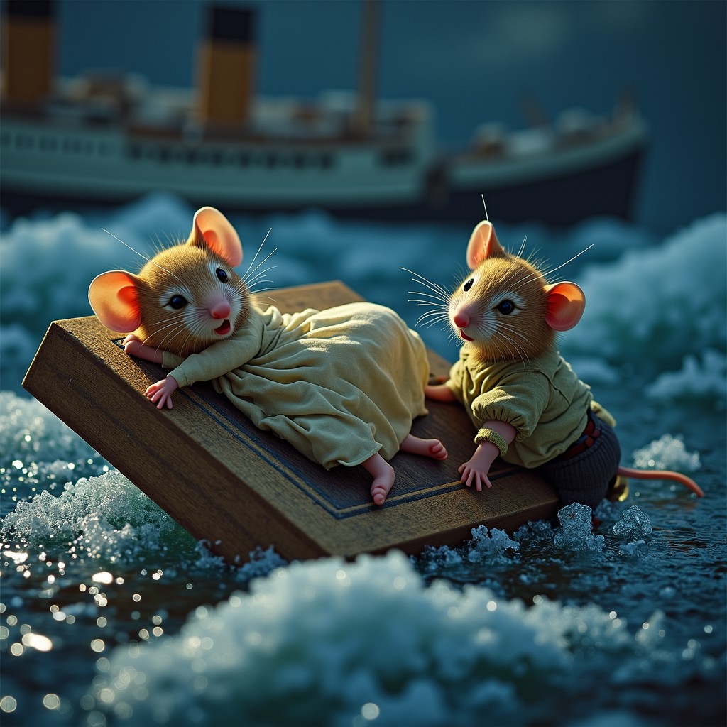 A scene inspired by James Cameron's Titanic, but with anthropomorphic mice instead of human characters. The female mouse, resembling Rose, is lying on a floating wooden door, clinging to it for safety. The male mouse, representing Jack, is holding onto the edge of the door from the icy water. Both mice are wearing tiny, tattered versions of early 20th-century clothing: Rose in a small dress and Jack in a simple shirt and pants. The background should show a dark, stormy night with icy waters and fragments of the Titanic in the distance. The mice's expressions should convey emotion, with Rose looking worried and Jack determined but cold