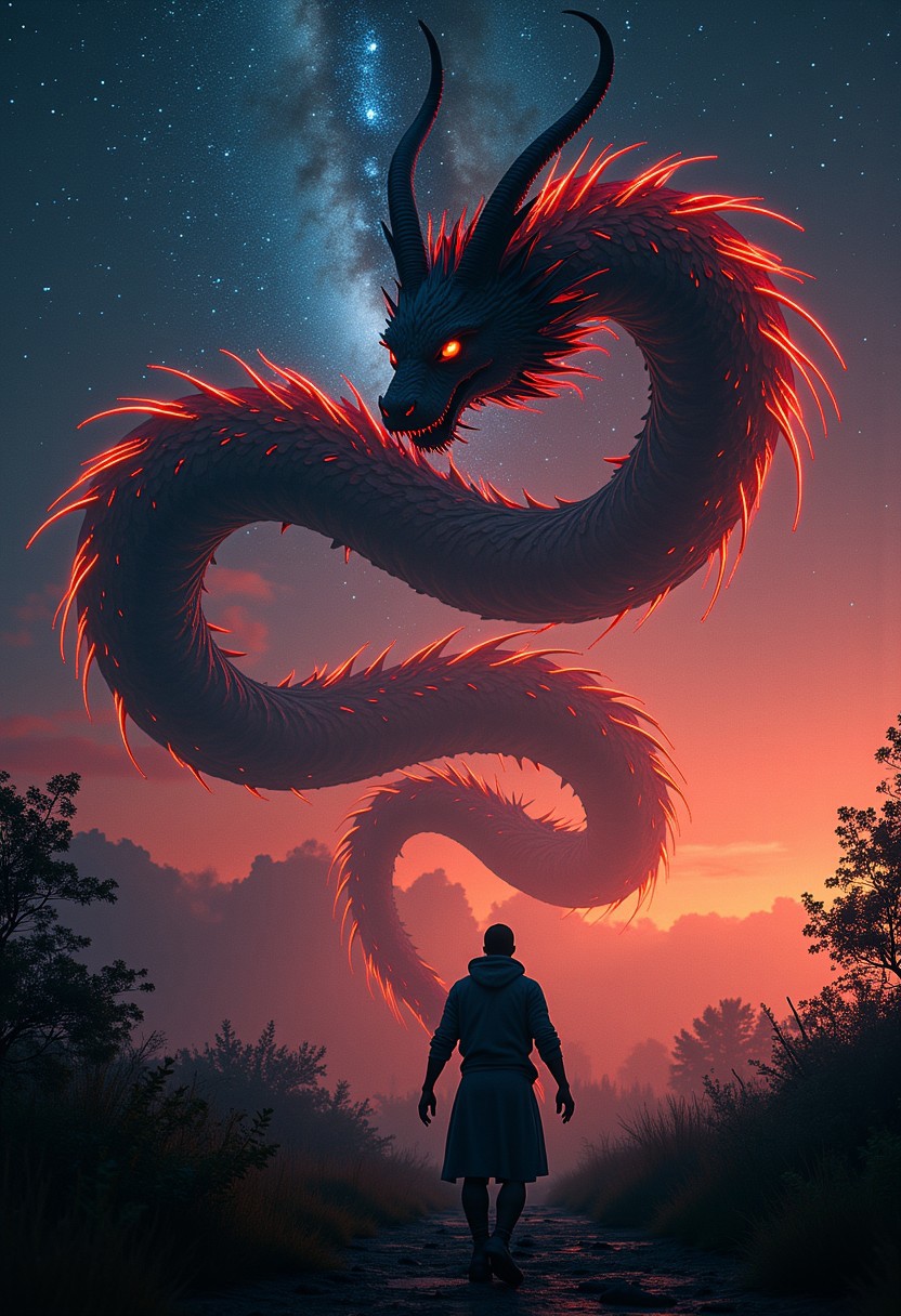 Bosstyle, Silhouette of a man fighting a giant DARK snake dragon Monster Boss resembling a ethereal nake dragon with goat hornes : Capture the essence of nostalgia and color in this vintage photograph. Dominating the scene is a meticulously detailed, translucent dark-red Blood filled dragon, adorned with vibrant patterns, blending seamlessly with its surroundings. Its long tail, composed of intricately woven ribbons in a spectrum of colors, trails behind, adding to the spectacle of the moment. Amidst the quietude of the night, its presence exudes a sense of ancestral strength and resilience. Behind it, the low-toned hues of the Milky Way cast a mesmerizing backdrop, a cosmic tapestry weaving tales of both past and future. In this moment, the convergence of tradition and technology, of ancient wisdom and industrial progress, hangs palpably in the air., atmospheric haze, Film grain, cinematic film still, shallow depth of field, highly detailed, high budget, cinemascope, moody, epic, OverallDetail, 2000s vintage RAW photo, photorealistic, candid camera, color graded cinematic, eye catchlights, atmospheric lighting, imperfections, natural, shallow dof, extremely detailed, vntblk, black, dark, background, NEG-fixl-2, bosstyle, Cinematic style, realism, cinematic quality