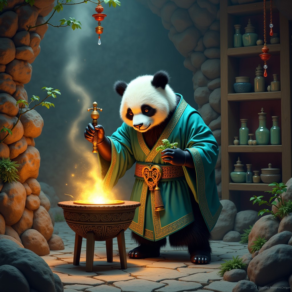 2 or more characters, An old chinese anthro panda alchemist is using a jade dragon tripod furnace to refine a mysterious elixir in a bauxite cavern. The panda is wearing robes of teal and gold and holding a strange herb. Apothecary's cabinets are placed against the wall of the cavern. There are a number of jade vials and boxes placed on a shelf. The scene has an atmospheric cinematic look with vibrant colors and contrasting shadows and light.