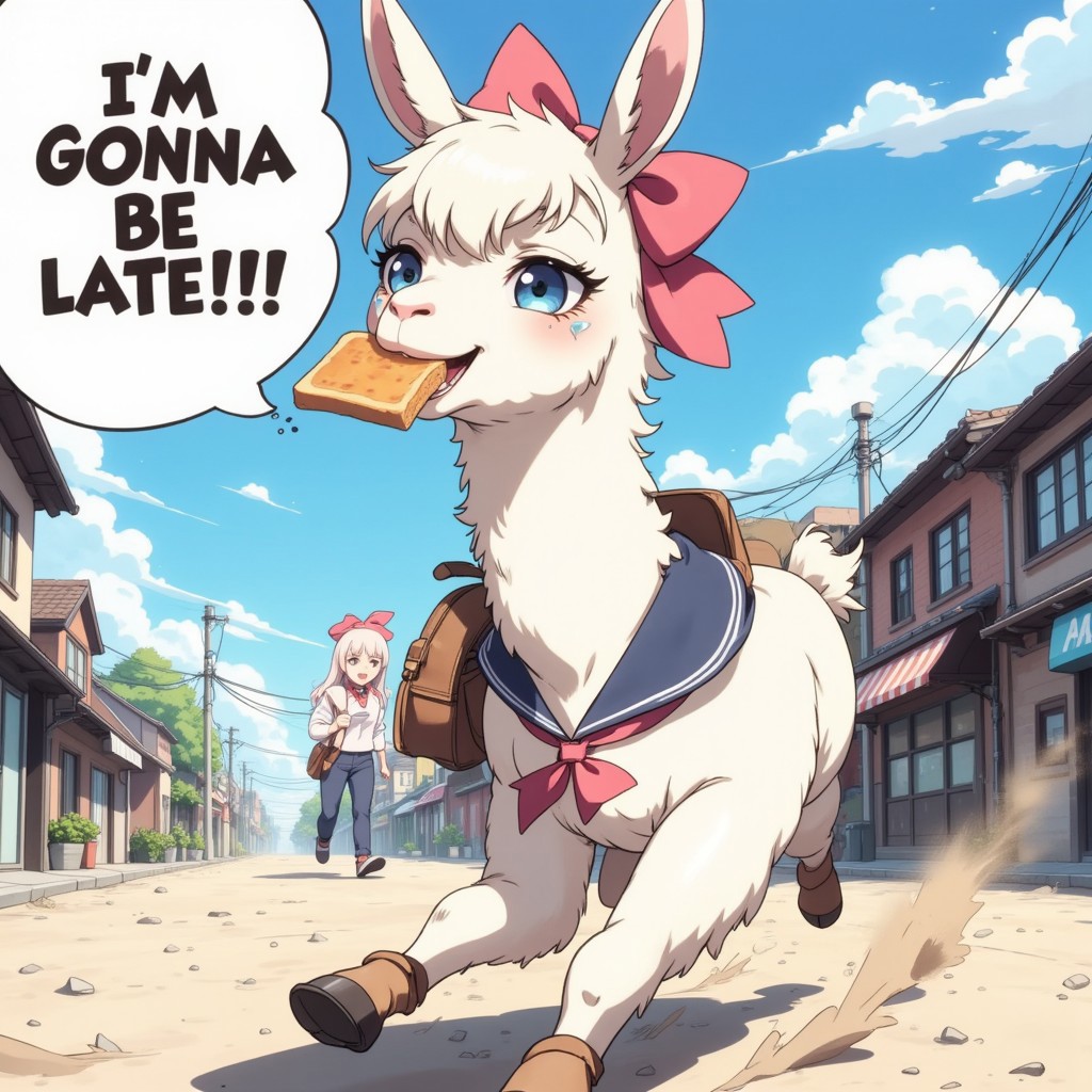 A detailed colorful anime illustration. An alpaca in sailor style uniform, with a pink bow on head and a schoolbag, is running sideways, biting a slice of toast in its mouth. It is shouting a bold black text: "I'm gonna be late!!!" with grin. Tears flow out from its eyes. Dust kicked up beneath its hooves. It is a sunny day, it is running in a Japanese styled town. fca_style