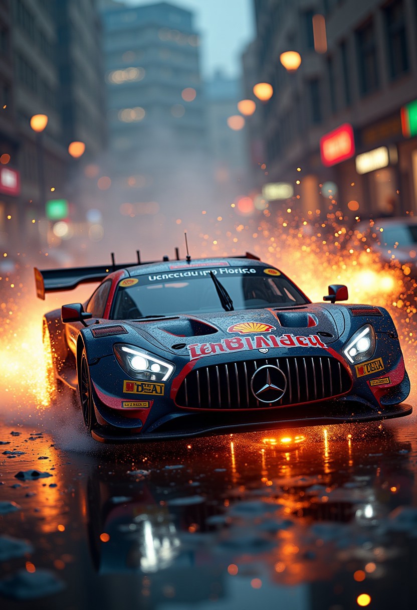 dynamic motion, (side shot), masterpiece, stylish design, battle chase, spark, Close up, car Racing, dramatic action scene, intense atmosphere, WTCR, adrenaline rush, racing track in the city center, (front of a car), racing cars, chase, modern chase, thrilling escape, F1 racing car in action, , fast sense of speed