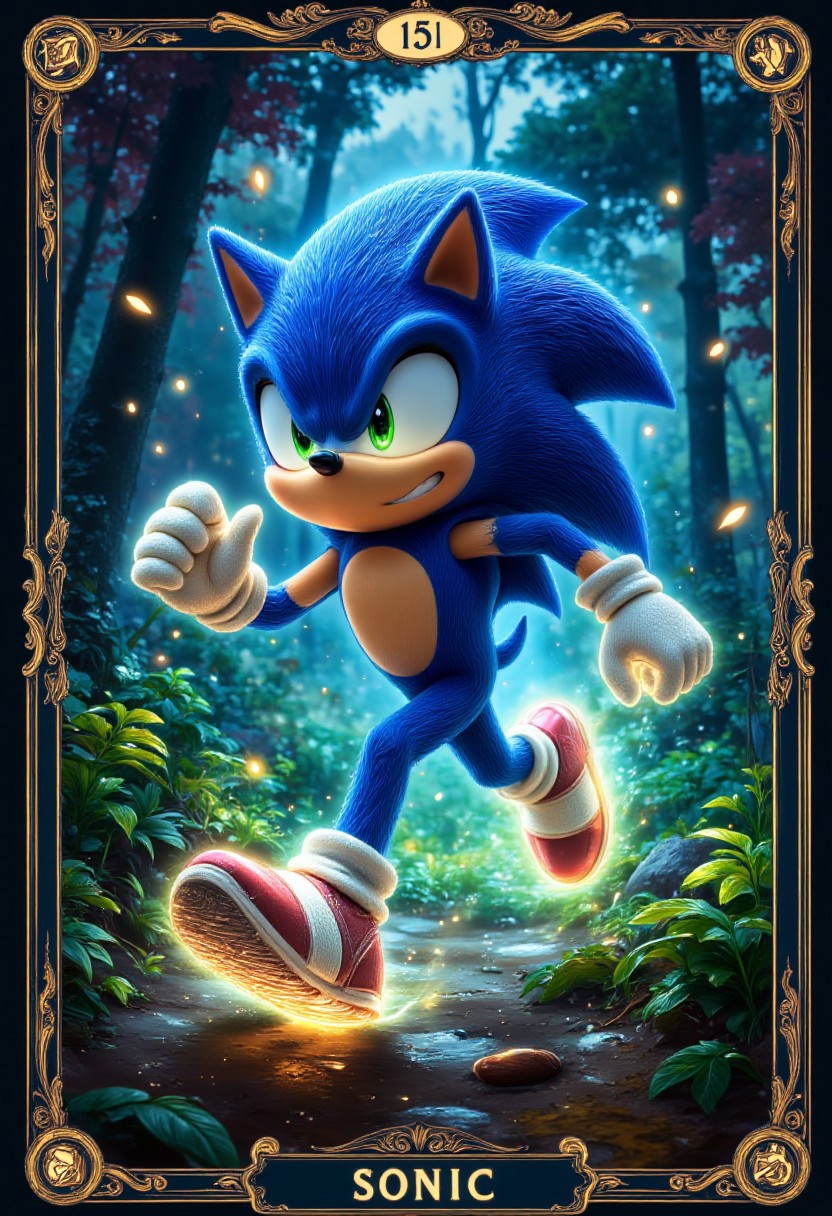 Sonic, running in Green Hill Zone, rings. Tarot Card, glow many details, extreme detailed, full of details , detailmaximizer, aidmaglow, midjourneyv6.1