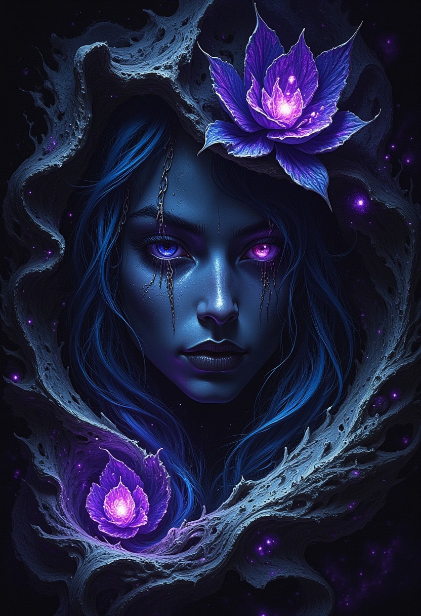 ArsMJStyle, dnddarkestfantasy, Dark Moody Atmosphere, Avant-garde, painting, evil, unsettling, best quality, masterpiece (Luis Royo style drawing), detailed face, face in sharp focus and intricate detail, extremely detailed, great lighting, BREAK, An alchemist's garden in the Lowlands, where plants glow with a luminescent blueish-purple hue. The alchemist harvests these nocturnal blooms, their potion bottles aglow with the same captivating light., in the style of the decaying empire of Würstreich, dark magic and grotesque creatures abound, inspired by Sean Aaberg's punk aesthetic, dark fantasy world combines grim landscapes with vibrant, exaggerated colorful art, heroes skirmish monstrous foes in a setting where rebellion, decay, and mysticism intertwine, crafting a unique, immersive vibe autumn magic, , blending the natural with the magical, Soft natural lighting, High Definition HD, High Detail, Perfect Composition, dark fantasy movie