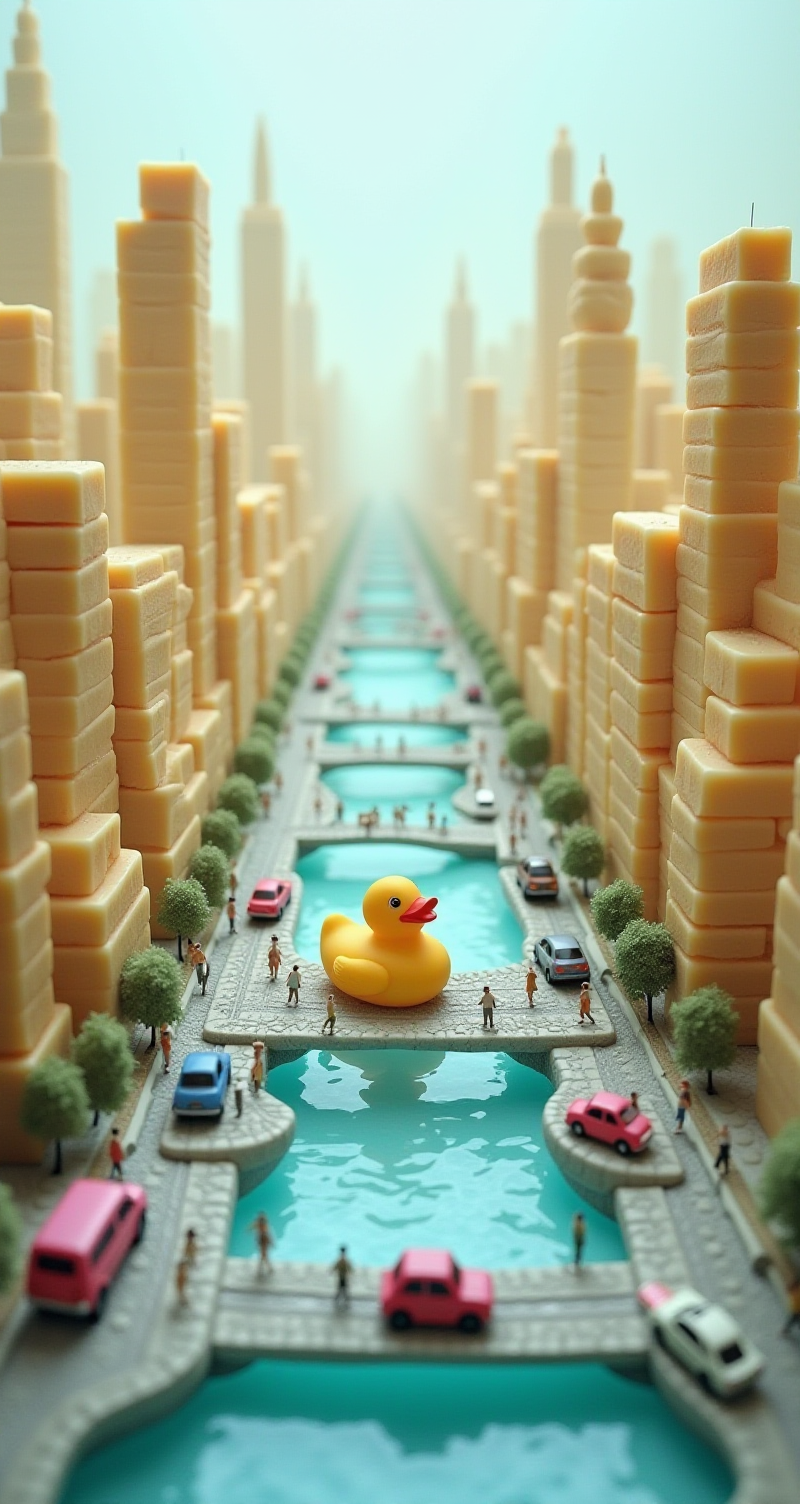 A bustling cityscape with skyscrapers made of soap bars and a rubber duck as the city's central fountain, complete with miniature cars zipping through the streets, and tiny people crossing bridges made from toothbrushes.