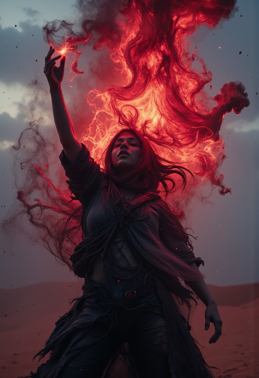 Vibrant Colorful Realistic analog photo, very detailed, hyper detailed, photorealistic, hyperdetailed, uhd, 4k, the focus of the image is on the witch, extreme closeup Face Portrait, extreme face closeup, head focus, Realistic analog photo, awesome, high Quality, photorealistic, atmospheric lighting, volumetric lighting, cinematic, Epic Film Quality, A buxom witch stands in the midst of a ferocious DARK sandstormamidst a Desert night, her tattered robe barely clinging to her body, revealing glimpses of her sweat-slicked skin. With one hand raised, she conjures a colossal, ancient vibrant black negativ luminous light spell from the swirling dust, its ethereal ghostly form towering above, terrifying and awe-inspiring. The hkmagic witch’s face is shrouded in the shadows of her hood, adding an air of dark mystery. The colorful Flower meadow landscape around her is cloaked in a dusty, dystopian atmosphere, with the sun obscured by the storm. The only light breaking through the chaos is the glowing dark-red aura of her powerful spell, casting an eerie illumination over the scene.