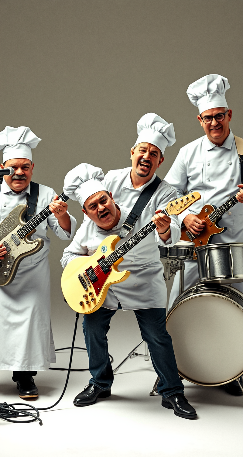 A rock band made up of very serious-looking chefs, with one chef shredding on a giant cheese grater guitar, another banging on pots and pans like drums, and the lead singer passionately belting out lyrics into a microphone shaped like a rolling pin.