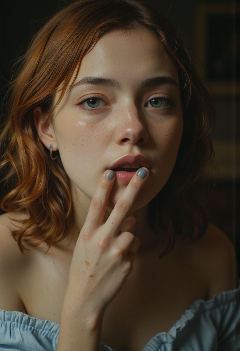Drooling, sweating, sweat, extreme Heat, wet skin, sweaty skin, Deep black Hair, Extreme Face and lips Closeup, Focus the lips, Busty, Realistic analog photo, awesome, grey-blue lipstick, high Quality, photorealistic, atmospheric lighting, volumetric lighting, cinematic, Epic Film Quality, dystopian Grey distressed cyberpunk, outworn, , blushed smiling, large bleaked marine-blue translucent sphere pearl earrings, realistic detailed skin, highly volumetric lighting, Cleavage, Feudal neo Tokyo in the Fantasy style of Jan Vermeer, ethereal charming wired princess Cyborg Samurai extreme intricate technical parts Face Closeup, wires and cables AS well as translucent Vintage mechanical robotic hoses, vibrant bleaked Red/grey and deep black color graded, Long blonde billowing hair, throwing kiss, Hairband,
