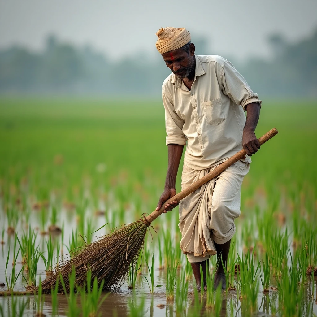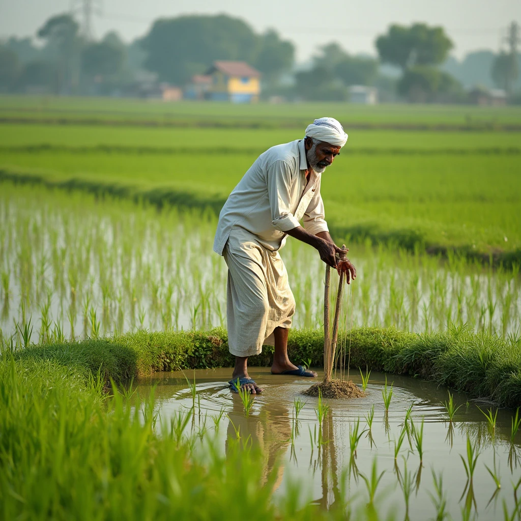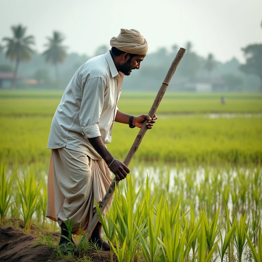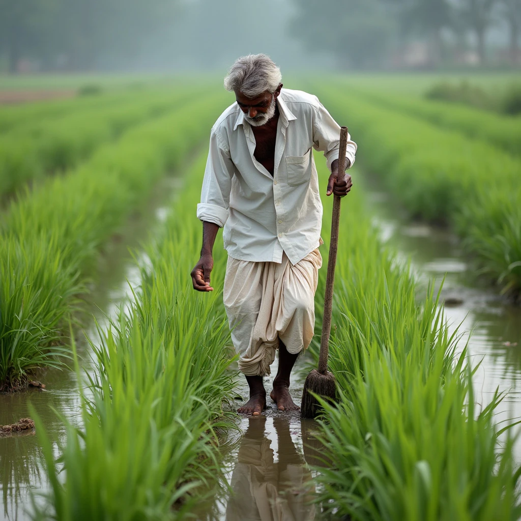 A visual of an indian farmer working in a paddy field, white shirt, white dhoti