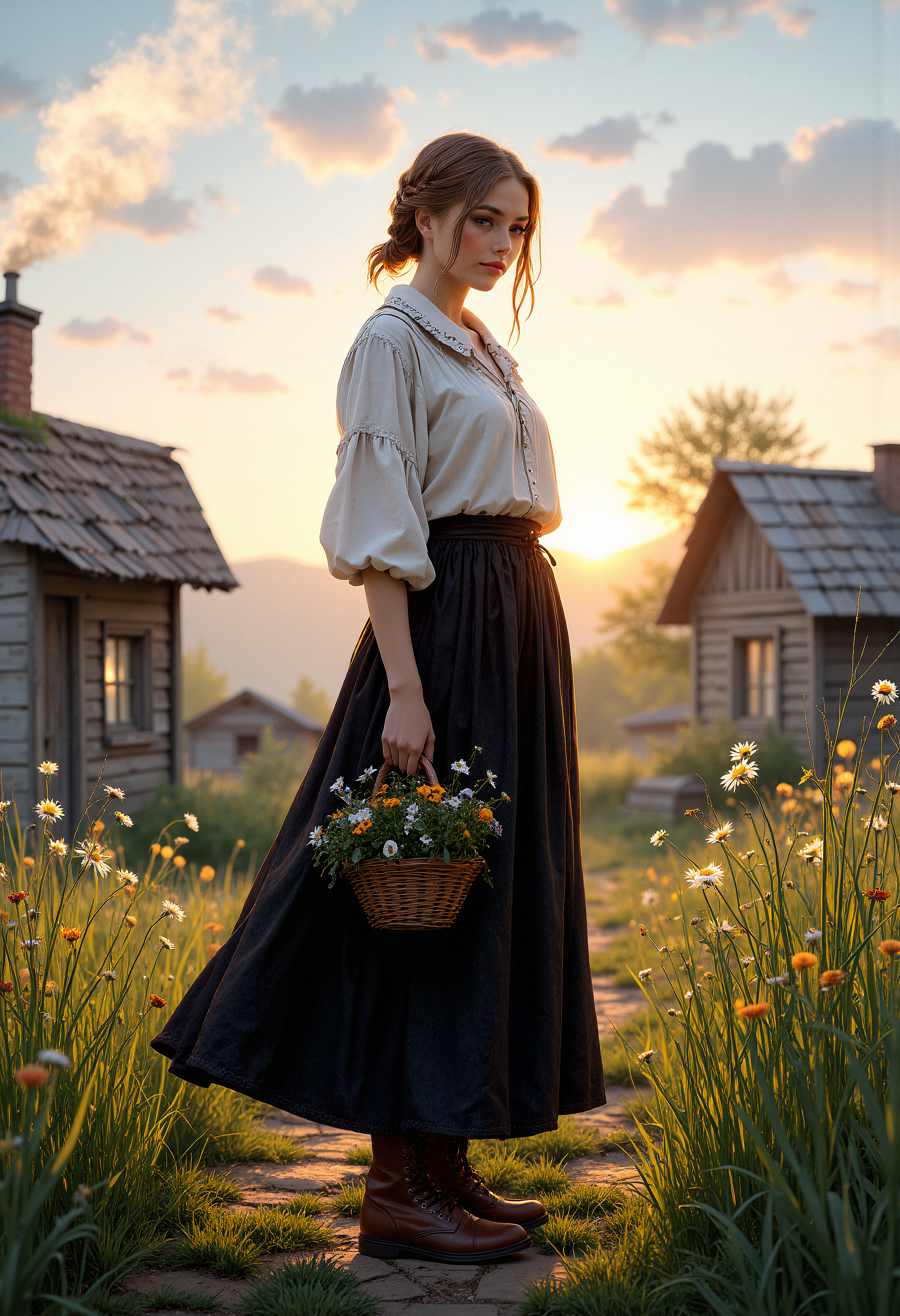 A modest Russian village girl, dressed in a simple white blouse and a long dark skirt, standing on a dirt path at dawn. Her hair is tied back in a loose braid, with a few strands escaping and gently swaying in the early morning breeze. She holds a small basket filled with wildflowers in one hand, and her other hand rests softly on her skirt. The sky is painted with soft pastel colors of dawn, with the first rays of the sun touching the horizon. The background shows traditional wooden houses, with smoke gently rising from their chimneys, surrounded by fields covered in morning dew. The atmosphere is peaceful and serene, with a sense of calmness as the village awakens to a new day. <lora:FluxMythP0rtr4itStyle:0.8> MythP0rt, <lora:aidmaImageUpgrader-FLUX-V0.1:0.33> detailmaximizer, <lora:Sinfully_Stylish_.02_for_FLUX-000002:0.1>